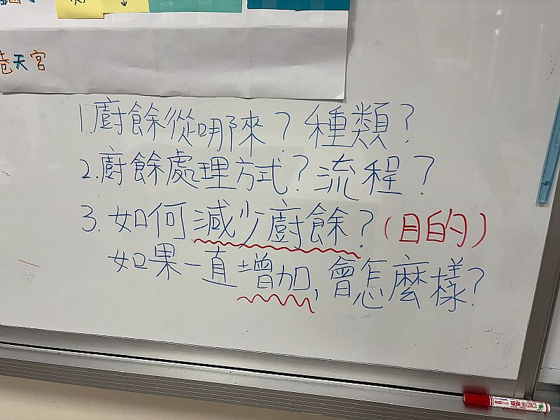 第二個問題是:「送來的剩食或廚餘會怎麼處理?」清潔隊說,以前剩食比較多會拿去給豬吃,但最近因為有「非洲豬瘟」,不能拿給豬吃了,他們會把剩食做成肥料。