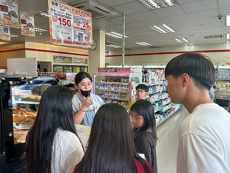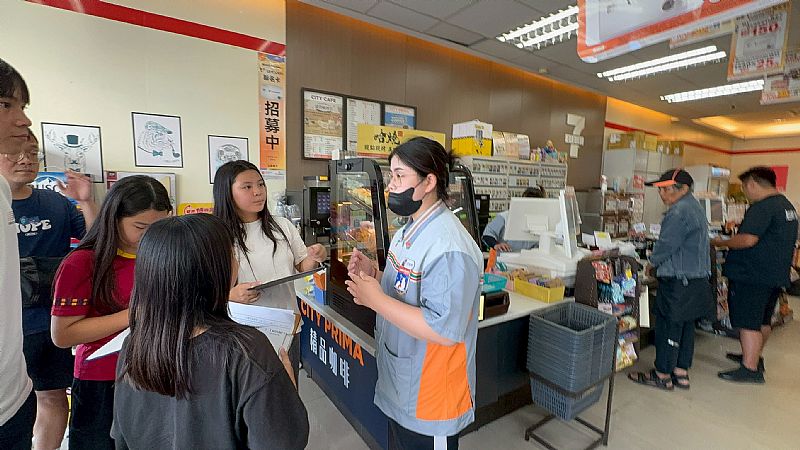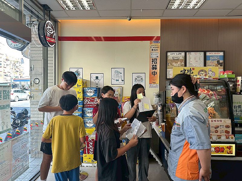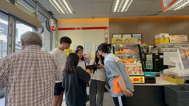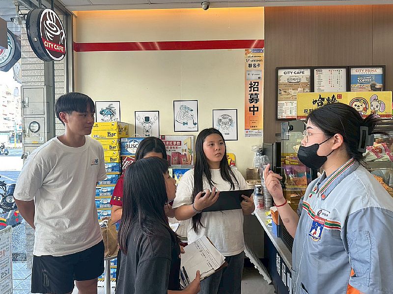 先說 7-11 吧。原本想訪問老闆,可是那天老闆不在,所以我們訪問了店裡的一位店員。一開始大家都有點緊張,不過我們還是很認真地一個一個問問題。