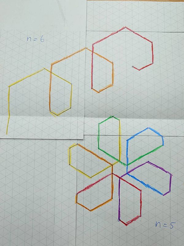 我們依照題目在紙上畫出n=5和n=6的循環圖形,但是因為底紙上的三角形印得太大了,所以我們只好將多張紙拼起來,才夠將整個圖形畫出來。