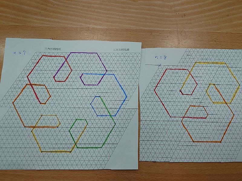我們依照題目在紙上畫出n=7和n=8的循環圖形,但是因為上次底紙上的三角形印得太大了,所以我們這次決定印小一點,結果又印的太小,且只有一小塊有底紙,我們只好又將多張紙拼起來,才夠將整個圖形畫出來,不過因為三角形印的比較小,最後的成品也比較小張。