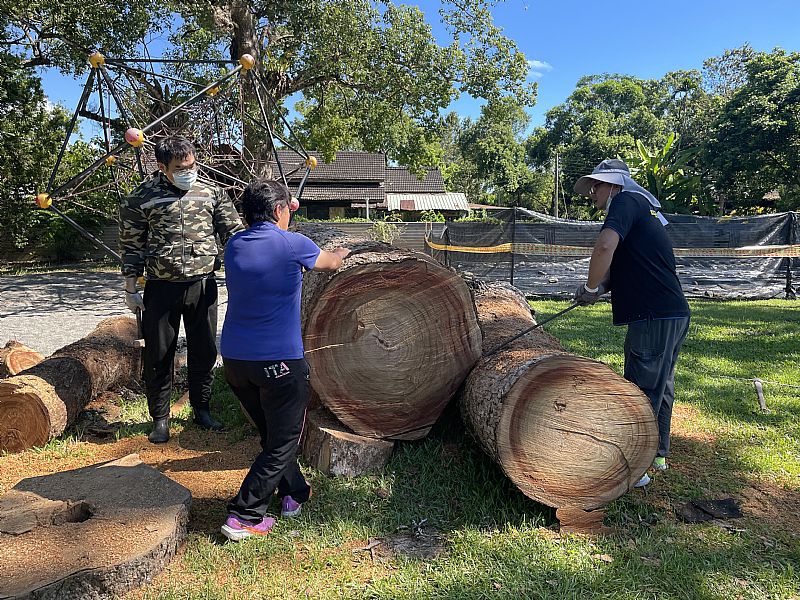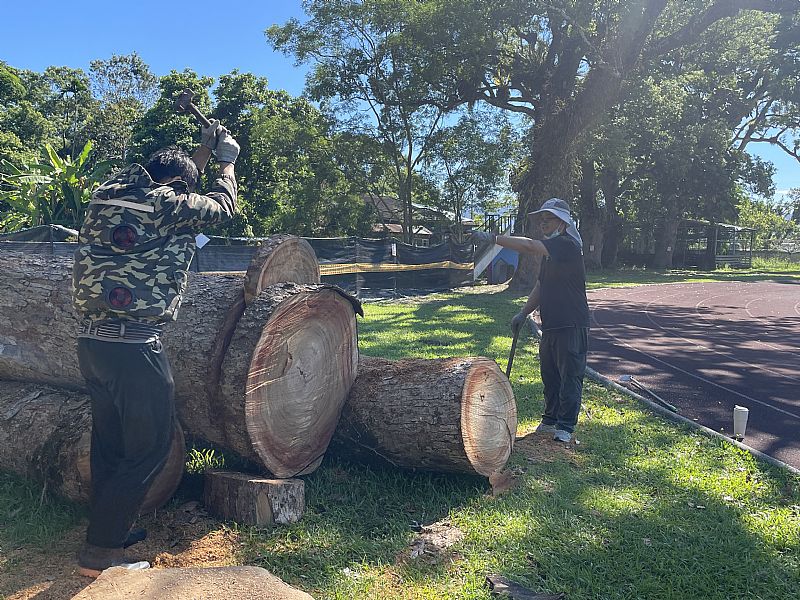 今天有木工專業背景的老師將編號18號樟樹部分的樹幹根樹枝做裁切,準備將這些部分做成學校的長椅、長桌,讓它可以成為我們校園的一部份。