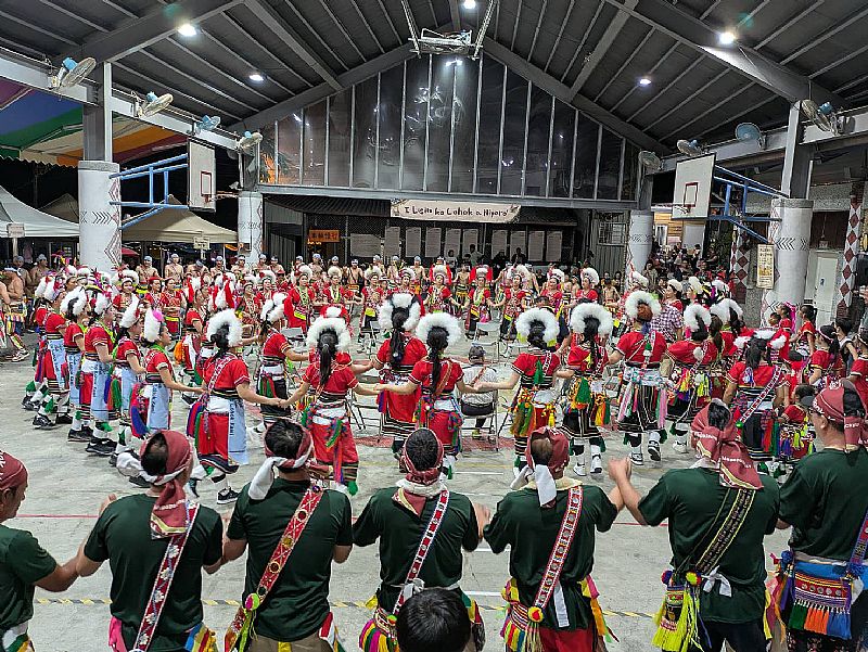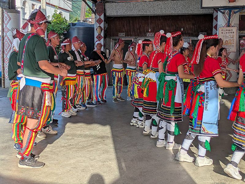 我們和老師前往豐年祭會場時,大家已經圍成一圈跳起舞來了,我發現這次的豐年祭各個年齡階層都有不同顏色的毛巾,也有不同的戴法。女生掛在腰帶上,男生則是綁在頭上,人也增加了很多。也在休息區搭了帳篷,還擺了攤位。大家在休息時也有許多有趣的娛興節目,像是小朋友的跳舞表演、老人家的闖關等。