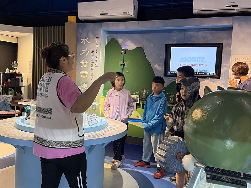第四站也就是最後一站,我們開車到銅門水力發電廠展覽館參觀,展覽老師跟我們說:「水力發電是水高速沖刷進入隧道中的壓力管,並沖刷水輪機發電。」展覽老師又說:「花蓮木瓜溪上游坡度變化大,有利於水力發電,建有銅門水壩與龍溪發電廠、龍澗發電廠、水簾發電廠、清水發電廠、清流發電廠、銅門發電廠、榕樹發電廠與初英發電廠等八座電廠,其中以龍澗發電廠的發電量最大。木瓜溪的水力發電排名於台灣第三,僅次於大甲溪與濁水溪,水力發電的流程為:河川的水經由攔水設施攫取後,經過壓力隧道、壓力鋼管等水路設施送至電廠,當機組須運轉發電時,打開主閥,後開啟導翼使水衝擊水輪機,水輪機轉動後帶動發電機旋轉,發電機加入勵磁後,發電機建立電壓,並於斷路器投入後開始將電力送至電力系統。如果要調整發電機組的出力,可以調整導翼的開度增減水量來達成,發電後的水經由尾水路回到河道,供給下游的用水使用。」