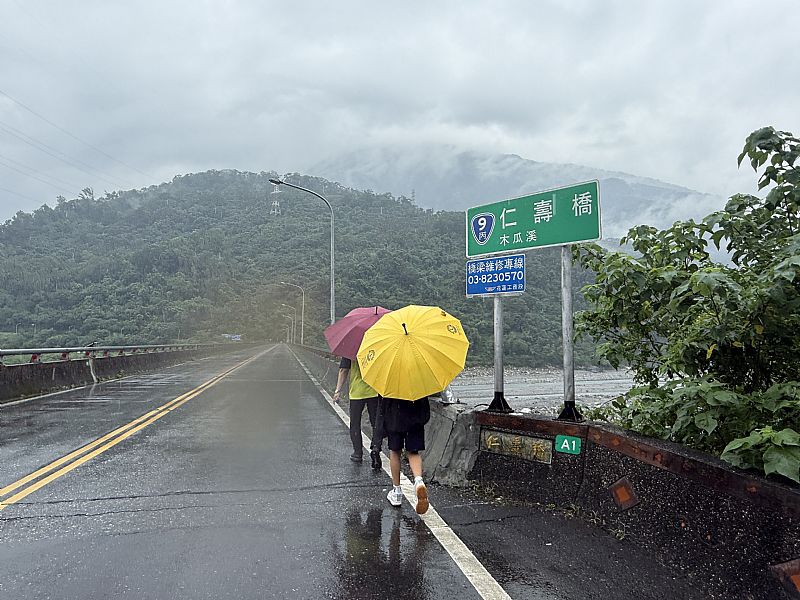 第二站我們開車到木瓜溪旁的仁壽橋觀察左邊的河合右邊的河有什麼差別,往高山看時,轉過來時老師跟我們說:「上游的河道較窄流速較快,中游的河道較寬流速較慢,下游的河道就變得更寬了所以比起上游流速較慢。河道上有消波塊用來防止內陸被侵蝕,旁邊還有機器用來測水位、水流量。