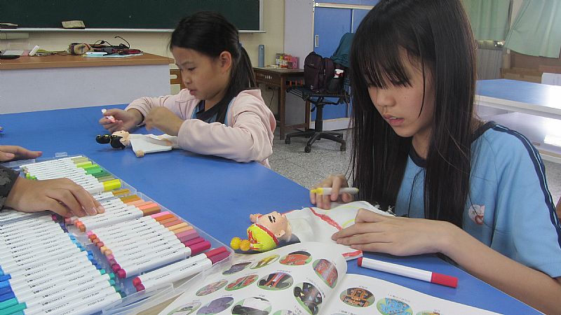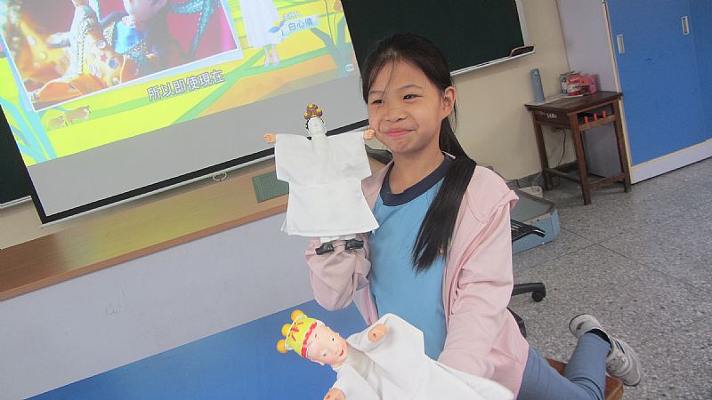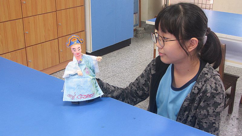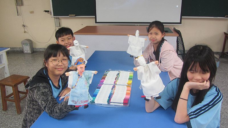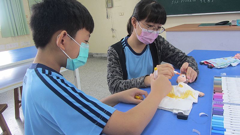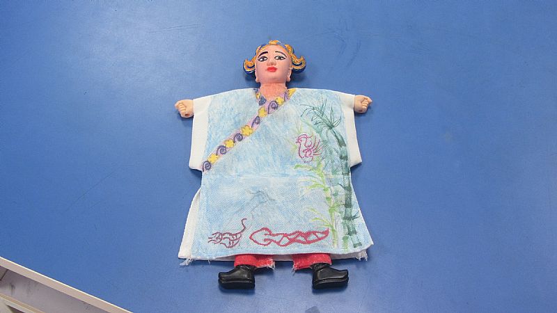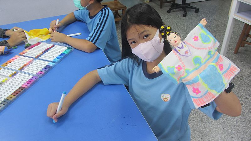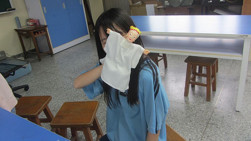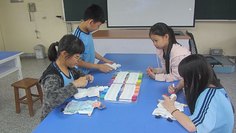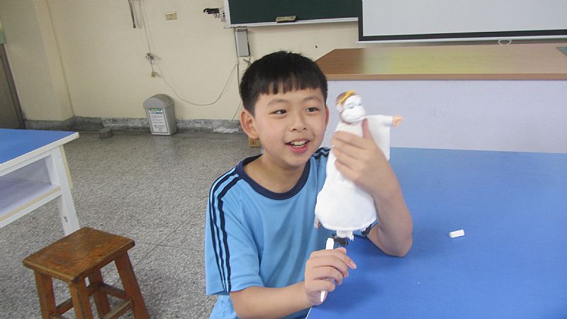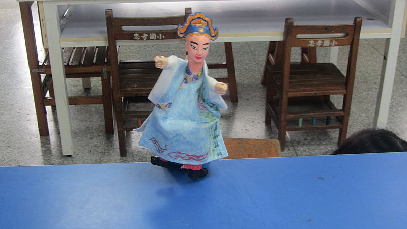 5/8(四)這一天,余主任拿出四個白色的布袋戲偶讓我們挑選,有花旦、武生、文生和孫悟空。我接收了同學給我的武生。馥亨同學接收了孫悟空。他說一定要用水性彩色筆塗色,不能用油性筆,不然的話會透到其他的布面上。洪老師也找了幾個布袋戲偶的服裝圖片供我們參考,並且指導我們塗色的方法。她說將頭髮、臉部和衣服塗出喜歡的顏色,還要畫上幾個花樣才會好看!