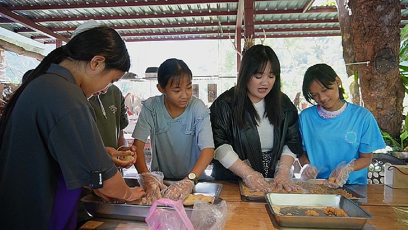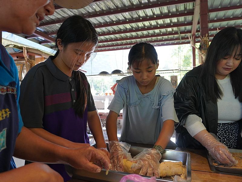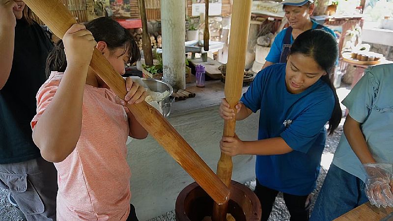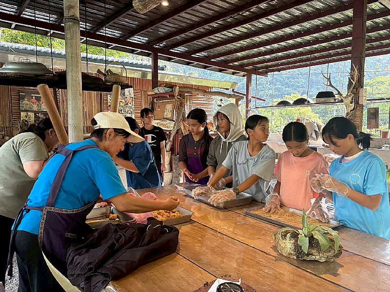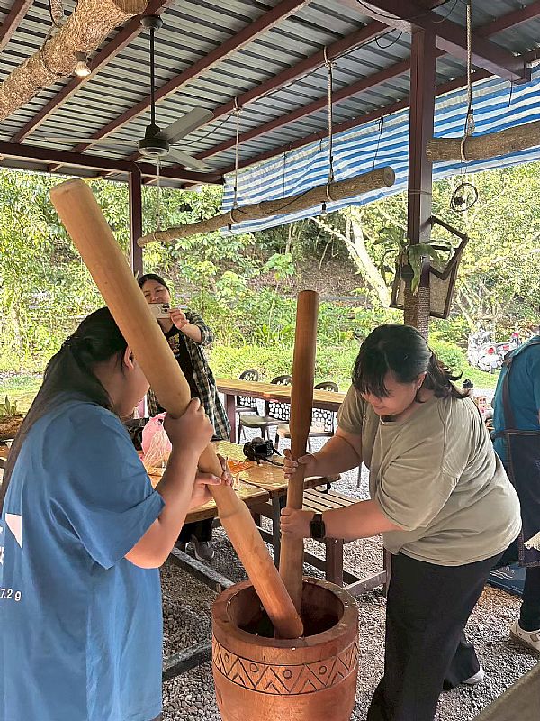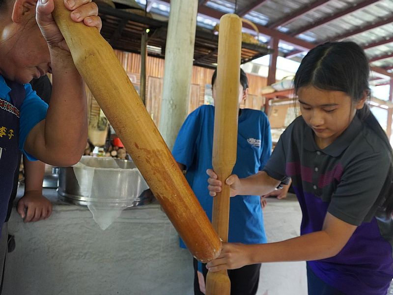 老師將煮熟的糯米放在臼裡面,老師先示範了要如何搗麻糬,臼旁邊站兩個人,腳尖頂住臼,兩隻手握住杵,兩人依序搗麻糬,示範完後,大家兩人一組的開始依序完成,打到黏黏糊糊的,麻糬搓成一顆顆的,像一顆顆的李子一樣。
