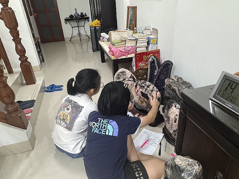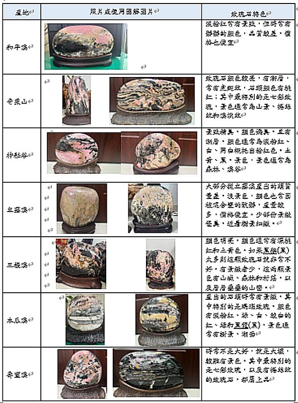 今天到謝廣錚老師家做實地踏查,我們完成花蓮玫瑰石產地表,裡面總共有7條溪,每條溪產出的玫瑰石也都各自的特色,第一,奇萊山產出的玫瑰石顏色較亮,有漸層,常有虎斑紋,石頭顏色有桃紅;其中最特別的是七彩玫瑰其中有咖啡、橙色、土黃、綠、白、黑,景色通常為山景、捲絲紋和溪流紋。第二,立霧溪神祕谷所產出的石頭景致精美、有漸層,顏色通常為淡粉紅、白、用白襯托出粉紅色、土黃、黑,景色通常為森林、溪谷。第三,和平溪產出的玫瑰石顏色為淡粉紅常有景致。第四,立霧溪產出的玫瑰石產量較多,少部份近看樹景細緻顏色通常以黃色為主,而小部分的顏色有非常淡的粉紅色,但大部分從立霧溪產出的頭質量差、沒景色,顏色也常因被混合變的骯髒比。第五,木瓜溪,產出的石頭顏色有淡粉紅、綠、白、較白的紅、綠和黑龍(黑),景色通常有樹景、湖面。第六,壽豐溪,用色明亮、有捲絲紋、上彩碼腦且多彩,石頭的顏色有桃紅色、土黃、綠,景色通常為山壁、溪流。第七,三棧溪,產出的玫瑰石有漸層和天然線條,且顏色明亮,顏色有深桃紅、土黃、黑猴(黑),景色通常有山城、森林和村莊,層層疊疊的山巒。總之,在這次的實地踏查中我發現在不同溪流所找到的玫瑰石,不僅景色用色不同,價格也會差很多,例如立霧溪的石頭產量多淡,石頭質量差,價格也便宜,而奇萊山和壽豐溪所賣的七彩玫瑰價格高,品質也好。