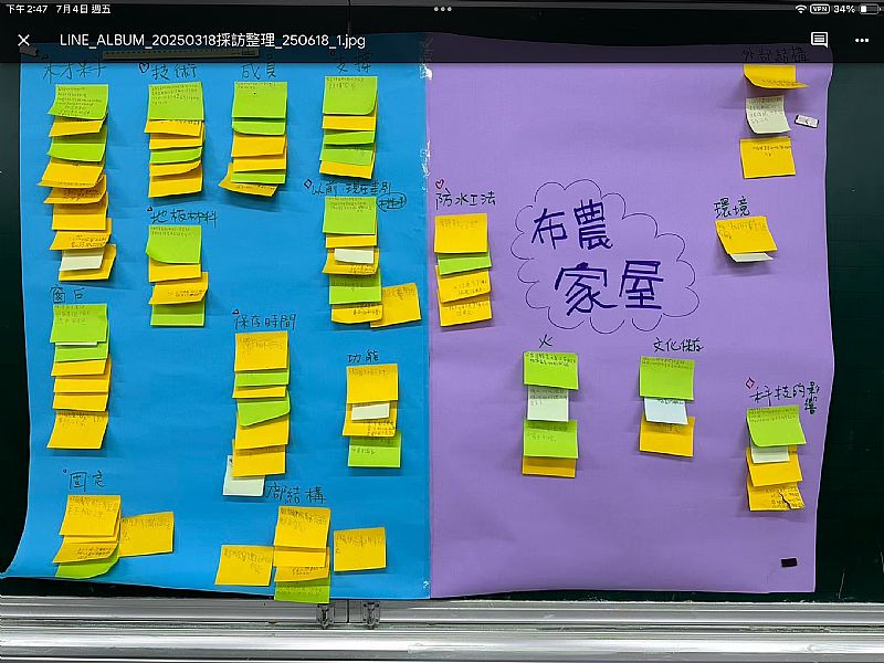 我們訪問完後,因為老師給我們一人一張紙條讓我們在紙上紀錄Dahul老師告訴我們的事實,然後到了教室後,我們在教室整理資訊後,老師把一張紫色大張的紙貼在黑板上面。讓我們把資料都貼在上面。