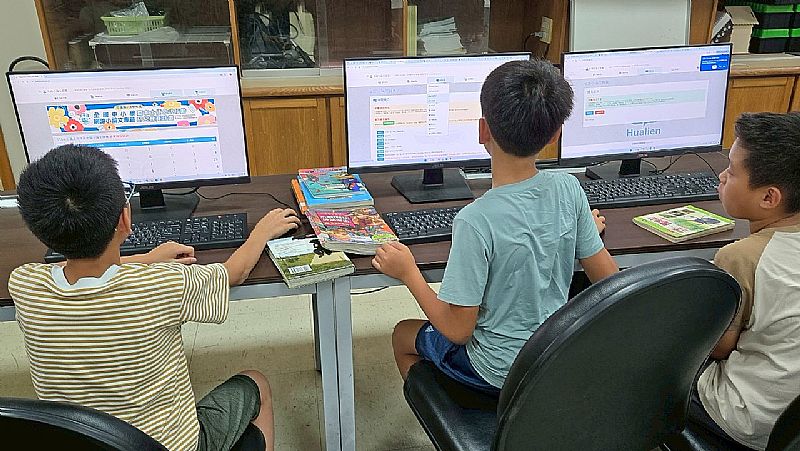 我們這組的同學坐在電腦教室的桌前,趁期末最後一點能一起討論的時間,一起分享資料及討論,希望在暑假前完成一點進度。每個人都專注於自己的螢幕,資訊科技與學習的結合,讓大家能更有效率地獲取知識,提升學習成效。