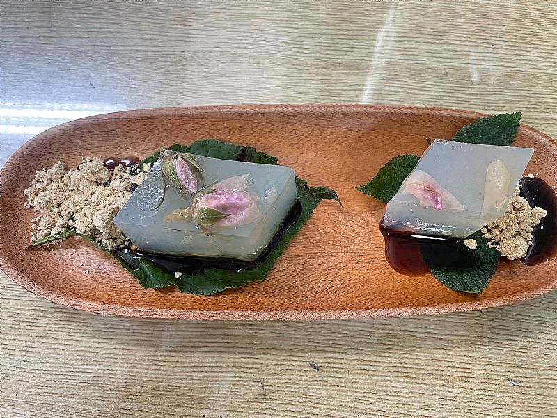 國語有一課<茶鄉鹿谷>,介紹臺灣有名的凍頂山烏龍茶,老師讓我們體驗古代人的跽,是一種坐在蓆上,屁股和腳緊貼的姿勢,日本現在還保留茶道的坐姿,配上點心,我們也就試著看看,而且老師一直教我們作日式小糰子、水信玄餅、紅豆羊羹、生練切押花樣,品嘗茶香,搭配和菓子。
