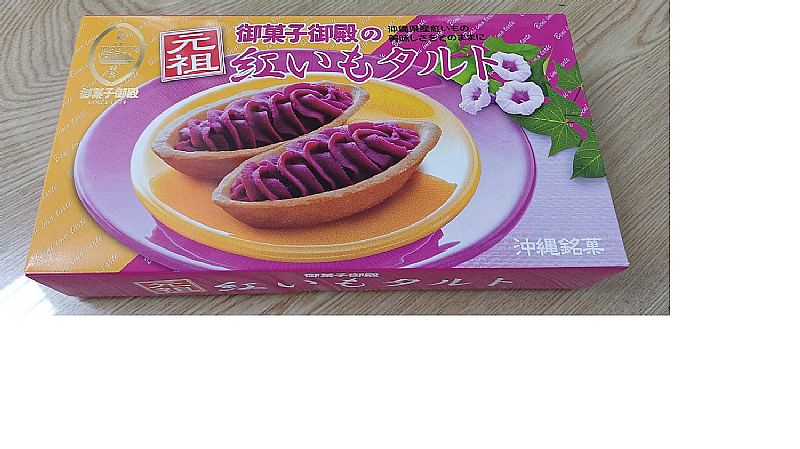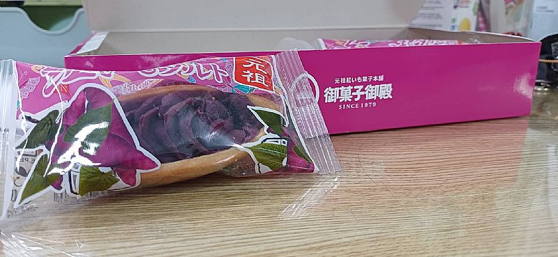 2025年10月1日我舅舅去沖繩回來,帶了沖繩伴手禮的經典,100%紫心地瓜泥的甜塔點心,日文寫作御殿紅いもタルト。商品誕生於昭和61年 (1986)的元祖店,比花蓮惠比須晚了87年呢 ! 10 月3日我們在練習的時候,我與組員一同分享美妙的口感--100%紫心地瓜泥的甜塔。