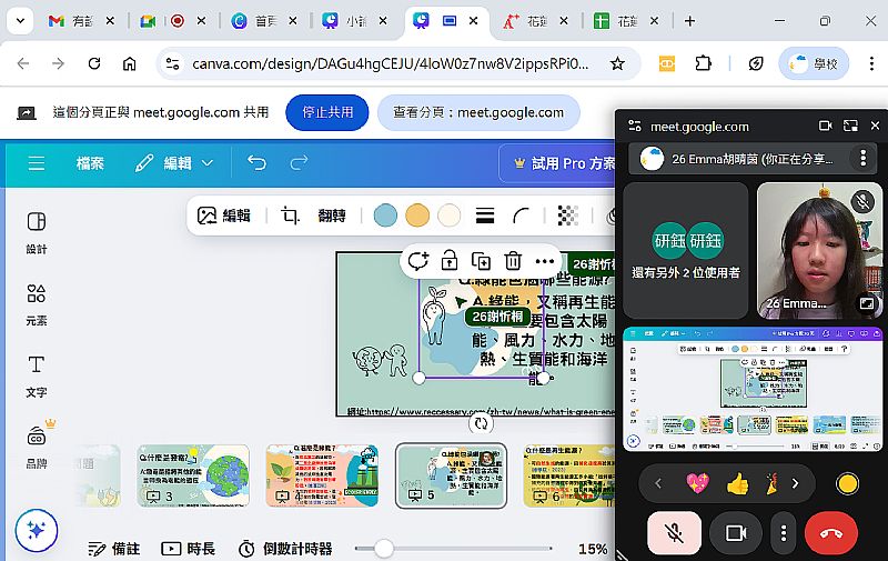 運用視訊,不用外出,在室內也可以討論;但是也有需多缺點,像是網路斷線、電腦無法分享畫面、還有,我們使用的Google Meet有時間限制,每次只能通話一個小時,讓我們沒有足夠的時間討論,只能用Gmail傳訊息通知組員。視訊討論雖然很有趣,但還是有許多不方便,可是,當我們沒有辦法到便利商店時,Google Meet就是很好用的工具!