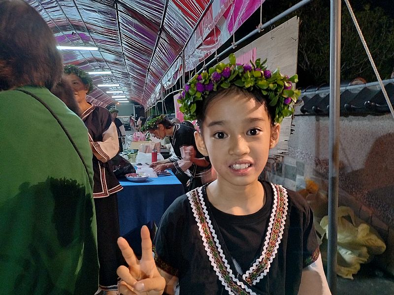 夜祭牽曲時,婦女頭上都會配戴花環,這些花環都是夜祭前一日女性族人聚集起來一起製作。