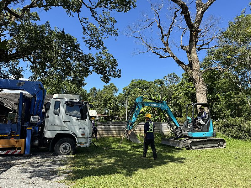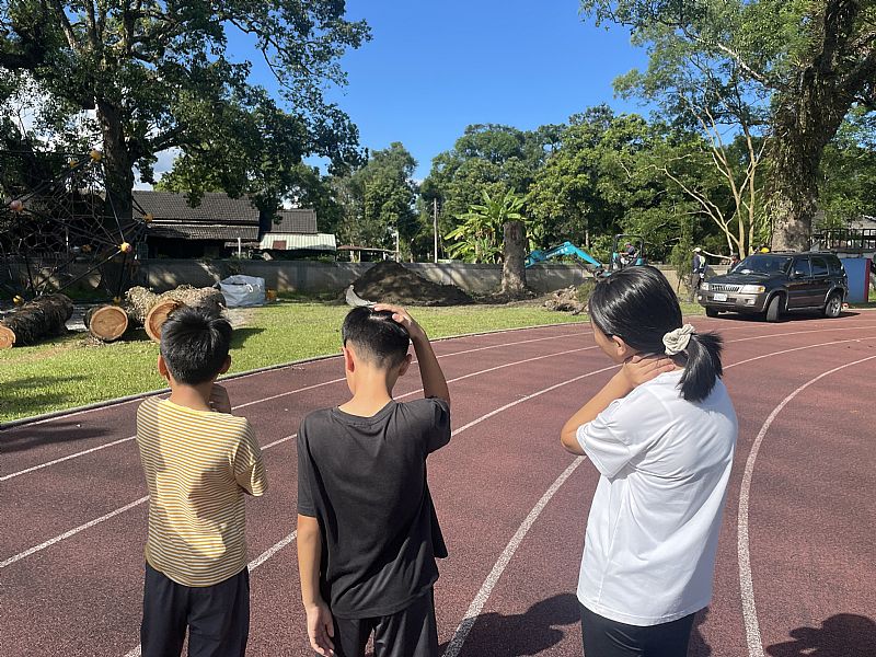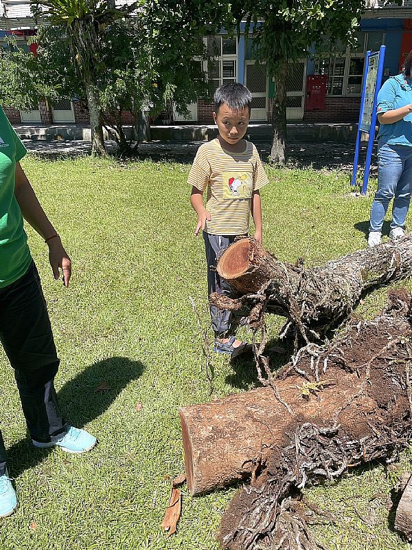 這天,砍樹的團隊就這樣帶著怪手進到校園了,就這樣老樹在一天之內就被推倒、砍掉了...但因為封鎖線還在,我們只能遠遠觀察編號18號老樟樹殘留的根...