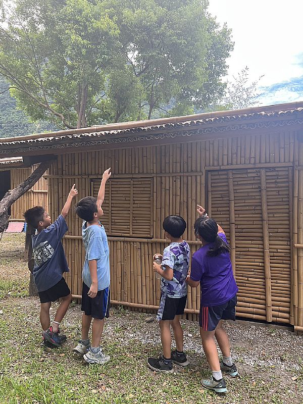 今天我們跟老師一起去看校園裡的竹屋。老師問我們為什麼我們太魯閣族人會蓋竹屋,我們一起觀察竹屋,你們對太魯閣祖先蓋的竹屋,哪一種結構你覺得很有趣,我們異口同聲說是租屋的屋頂,一開始以為屋頂一定會漏水,因為竹子中間有縫隙。結果老師說,這些竹子是剖成一半再互相扣住,雨水就會順著流下去,不會滴進來。我覺得這樣的智慧好厲害,祖先沒有水泥,也能用竹子蓋出不怕雨的房子。我們討論之後,決定想要做模型實驗看看,這樣的結構是真的不會漏水嗎?還是有別的擺放方式也可以不漏水,心裡很期待。