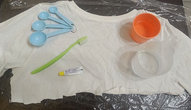 本次去污實驗所使用的物品包含:材料與工具兩部分。材料方面有牙膏、小蘇打、檸檬酸、酒精等四種清潔劑,另以醬油作為主要污漬來源,並準備白色棉質衣物作為實驗載體。工具方面則包含量匙與量杯,用以準確取用與調配清潔劑比例;牙刷則作為施力與刷洗的器具,以模擬日常清潔方式。上述物品皆屬生活中容易取得之物,能確保實驗的可操作性與重現性。