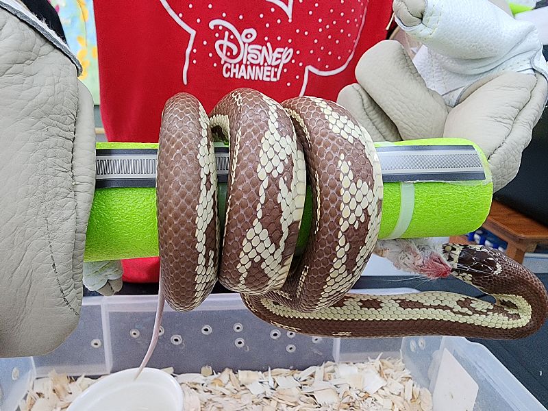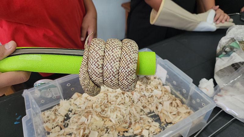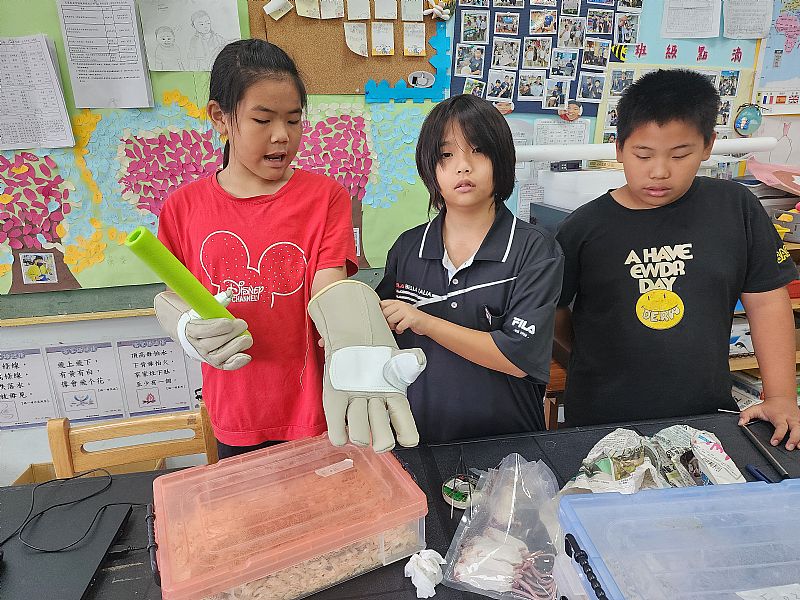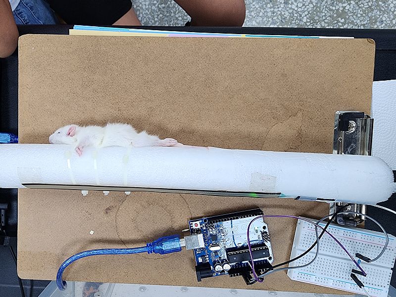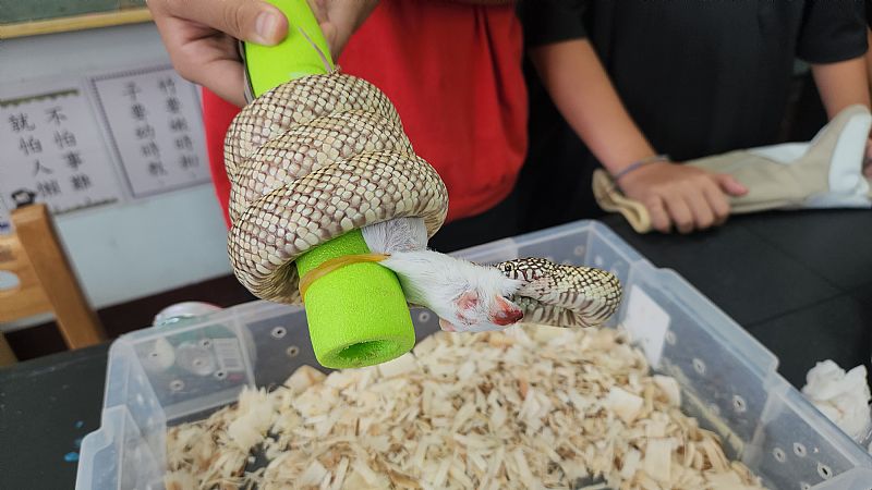 誘發器的製作讓我們花了不少時間,因為前後遇到不少問題,像是誘食器的粗細和形狀等等,弄不好的話蛇就沒興趣纏。一開始我們先用泡棉筒把誘發器給做好,做好以後我們再把誘發器上面塗小白鼠的味道,然後再看看蛇到底會不會去獵食而纏繞?但……似乎沒有我們預期的順利。後來不斷修改長度和形狀,還有放食餌在誘發器上面的方式,最後終於順利定案了!