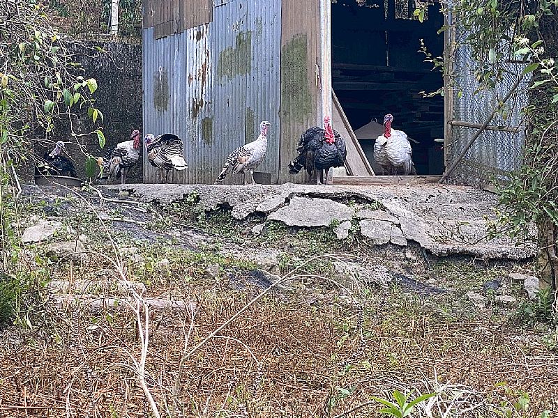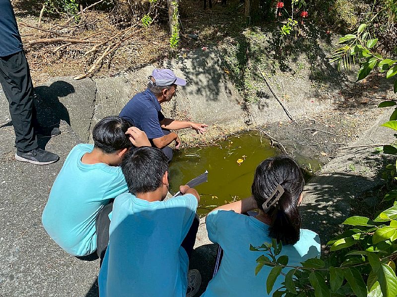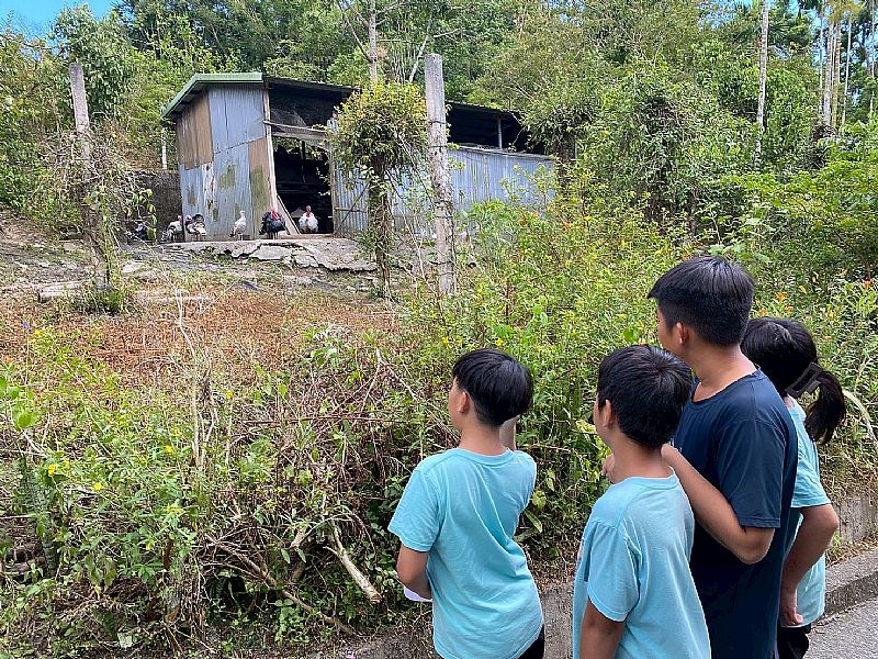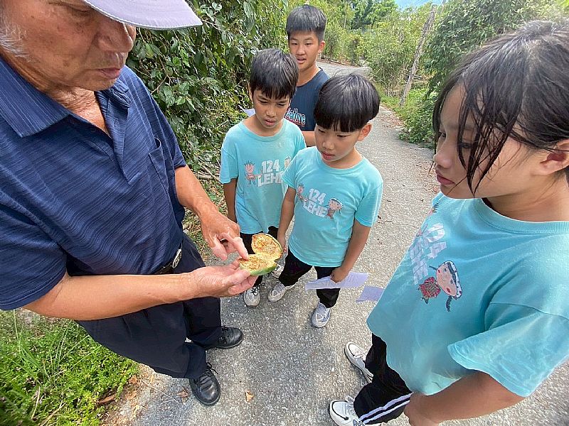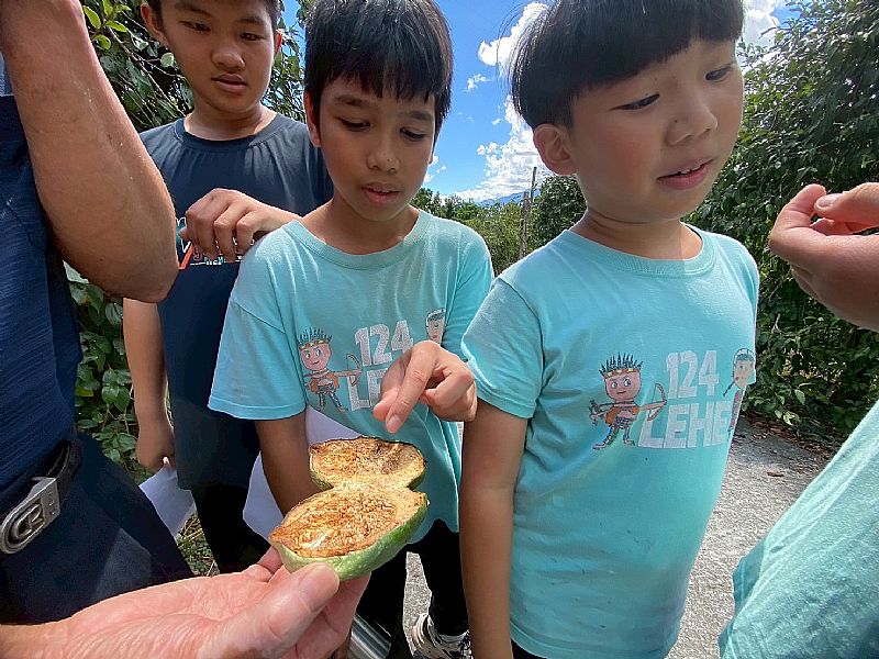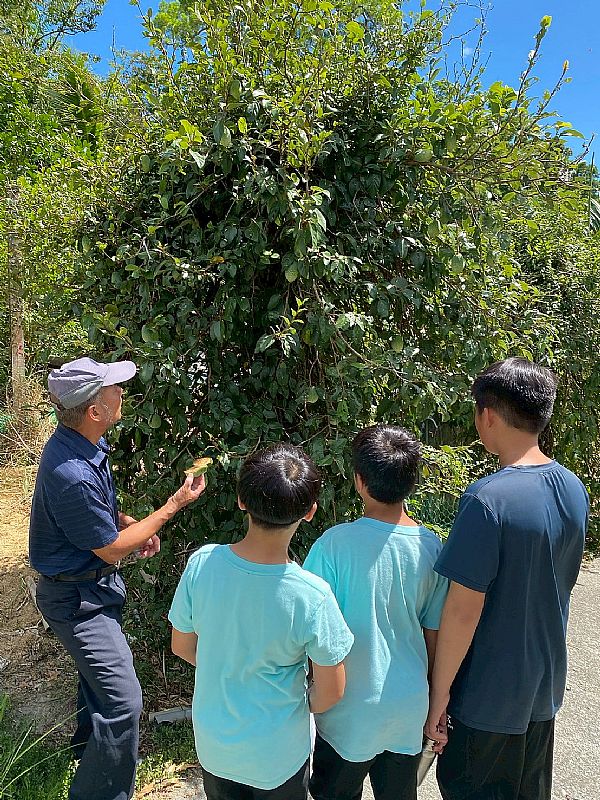 范伯伯帶我們觀察園區中的有機生態,介紹園區中以自然農法萬物相生相剋的方式經營,並且介紹他園區中的小幫手有小狗驅趕猴子,火雞吃天牛及其他小蟲,並在園區外圍種植香蕉樹提供猴子食物