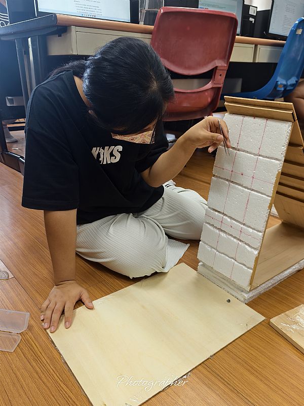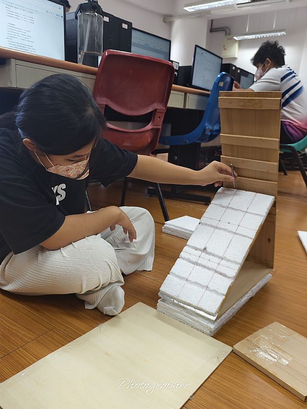 我們正專心製作一個落石模型,用來研究落石的滾動軌跡與距離。利用保麗龍斜坡和格子線來測量數據。這項實驗是為了探討落石的運動學,背景中其他同學也在進行相關研究,顯示這是一個動手操作與協作並重的學習環境。