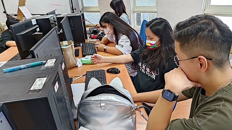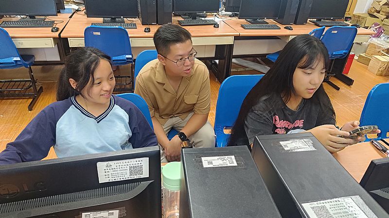 一個師生互動的瞬間。一位老師正在指導兩位正在撰寫小論文的我們。其中一位同學面帶微笑地聽著,另一位同學則專注地使用手機查詢相關文獻資料。這種場景體現了在學術研究中,老師的專業引導與我們積極尋求資訊的合作模式,確保小論文的內容更為豐富和嚴謹。