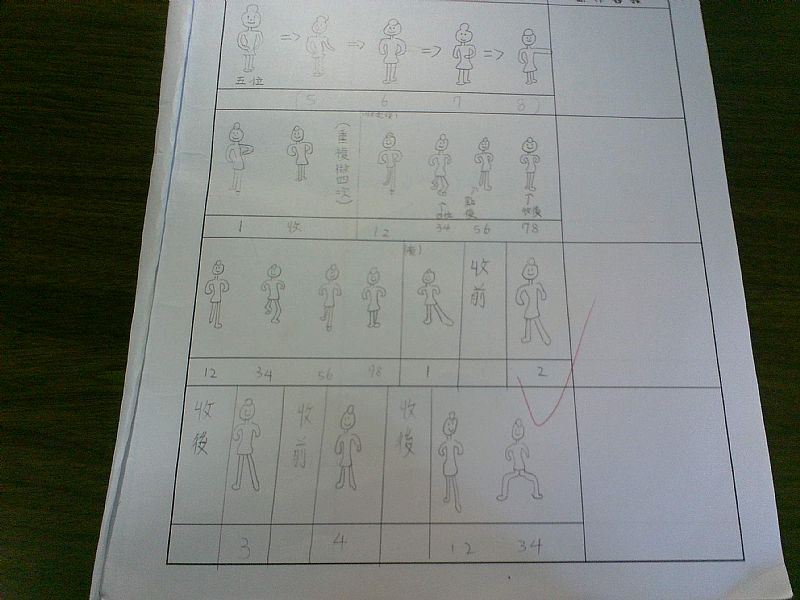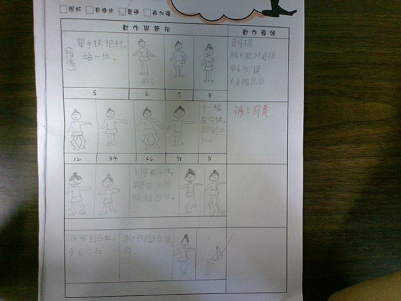 這些照片是我們在上完術科課之後,將課程中學到的動作組合整理並記錄在術科紀錄簿上的內容。除了畫出每一個動作的過程外,我們也另外標註了動作裡應該注意的要領與細節提醒,例如:該用力的部位、足弓要提不能塌、尾椎朝下、肚子要收等。透過這樣的紀錄方式,不僅幫助我們加深對動作的理解,也能在課後進行複習,確保每一次練習時都能保持著正確的姿勢與動作品質,這樣的整理過程對我們的學習內容、提升能力有很大的幫助。