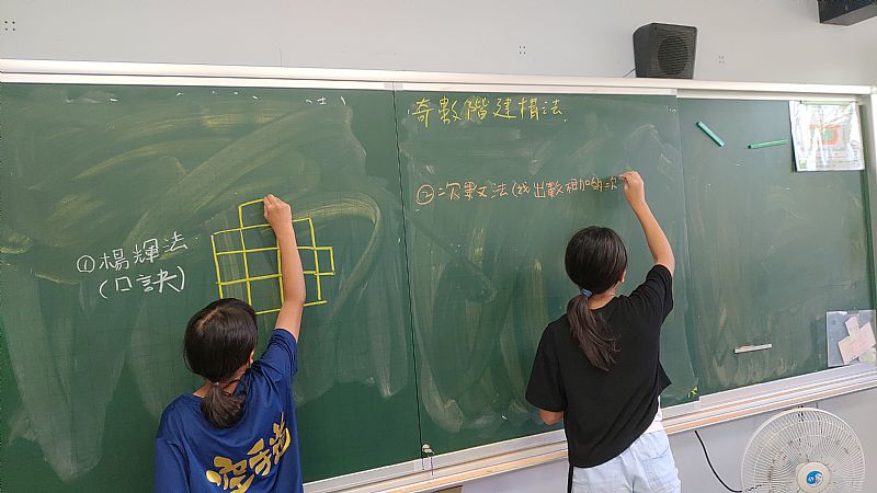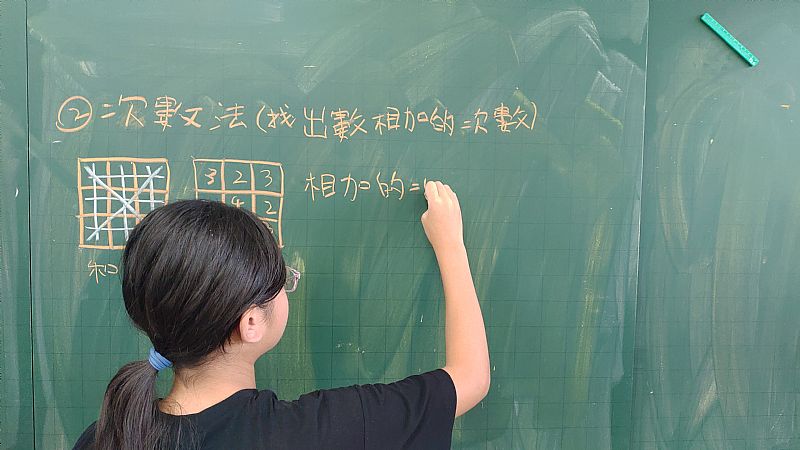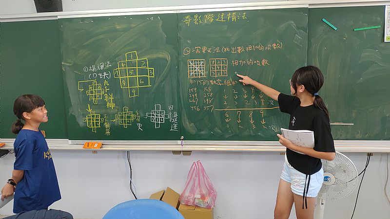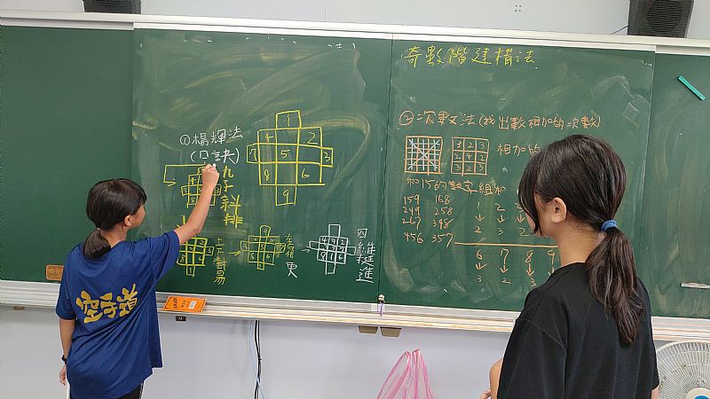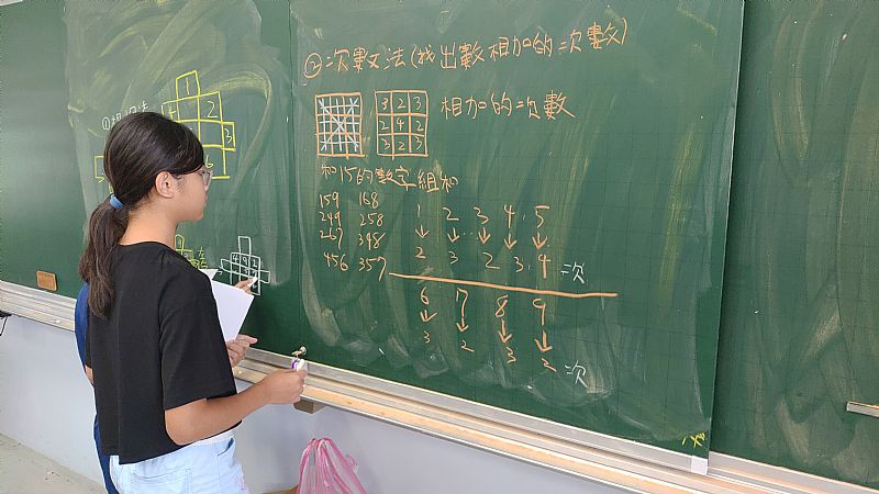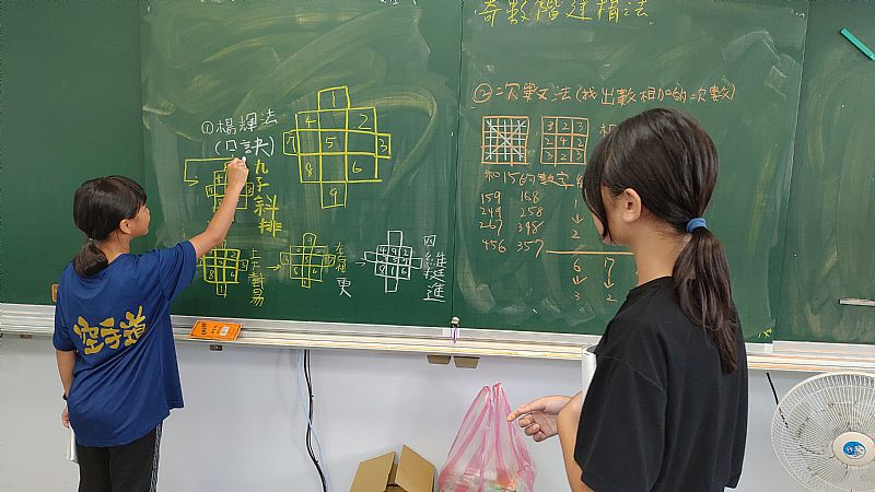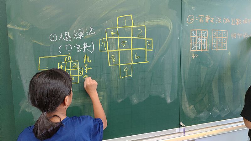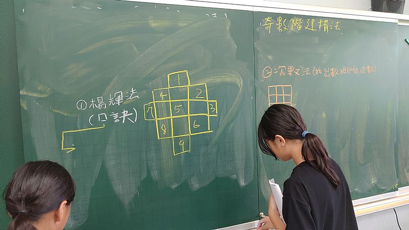 了解楊輝法的走位及口訣【九子斜排、上下對易、左右相更、四維挺進】,並用三階的魔方陣做練習,找出對應的數字跟魔術數字。