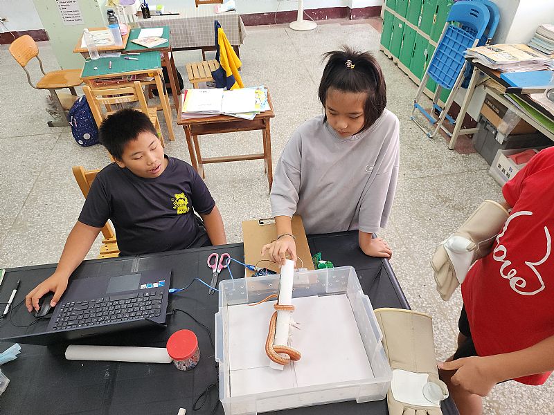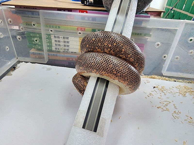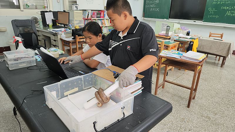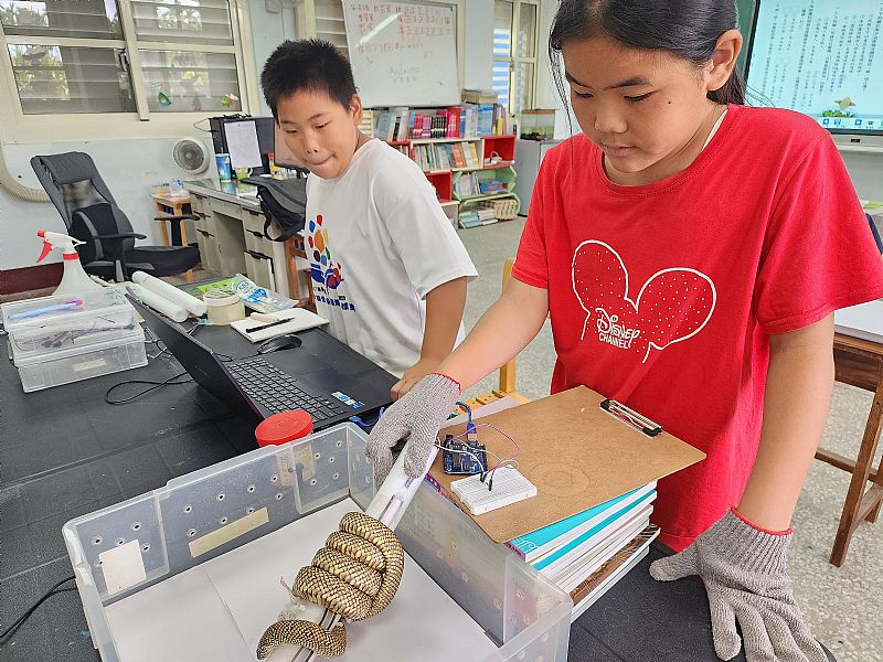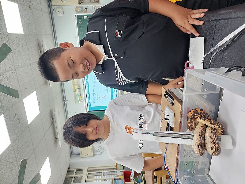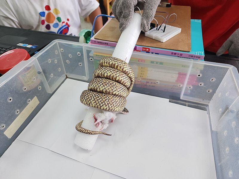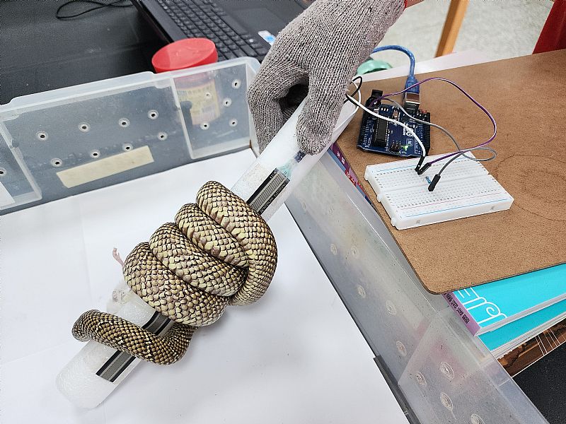 我們利用 Arduino 壓力感測器來測蛇的纏繞力,如果蛇纏得不完整,就必須重做。不同蛇的纏繞方式都不一樣,有的纏得緊密,有的交錯不整齊。還有,蛇的身體前端常因咬住獵物而懸空,導致部分力量無法被感測到,這也是我們實驗中需要克服的挑戰。