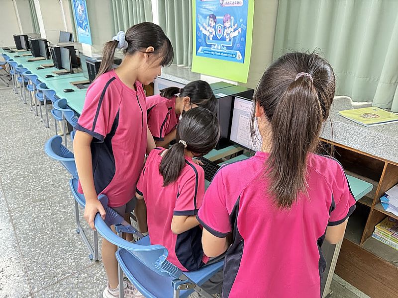 我們在電腦教室裡找手機遊戲成癮的資料,我們一起做小論文一起討論,有點開心。