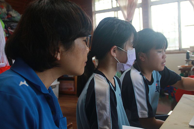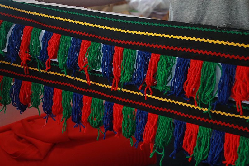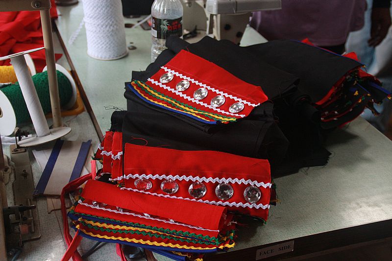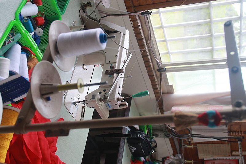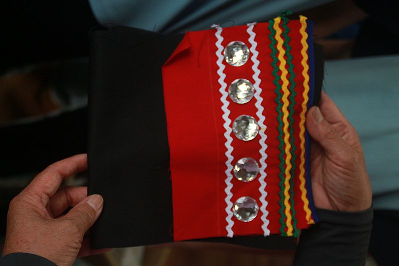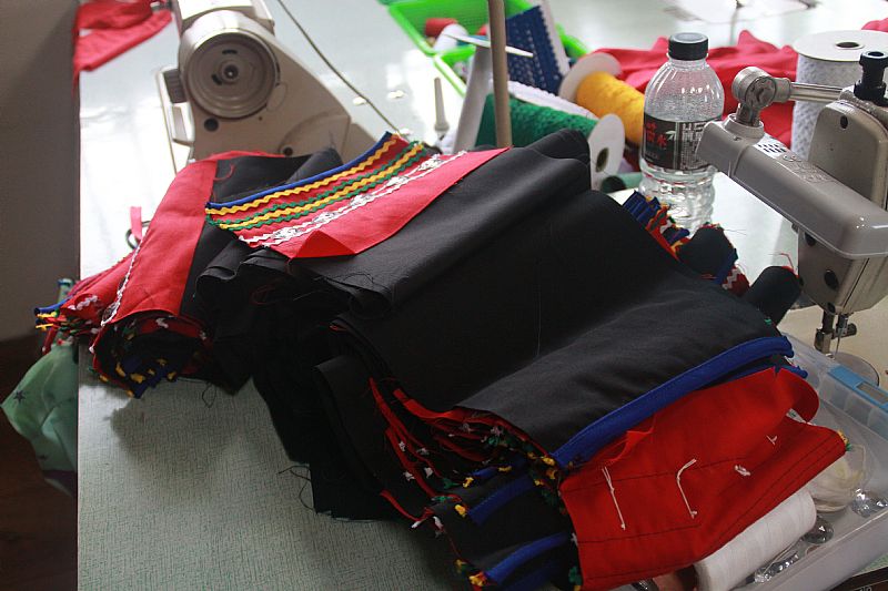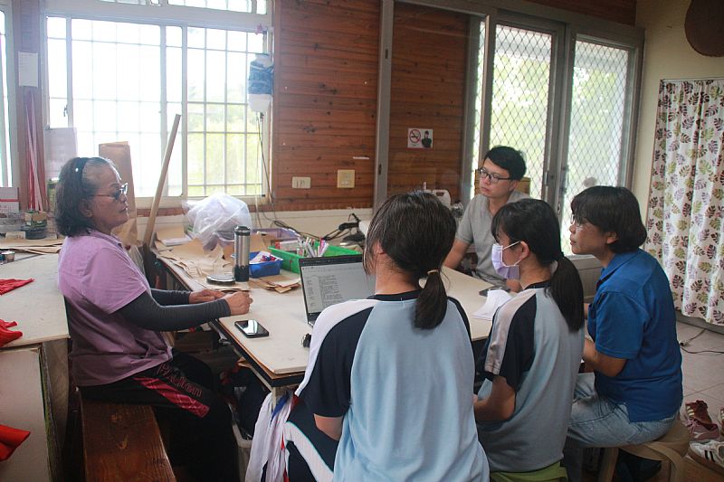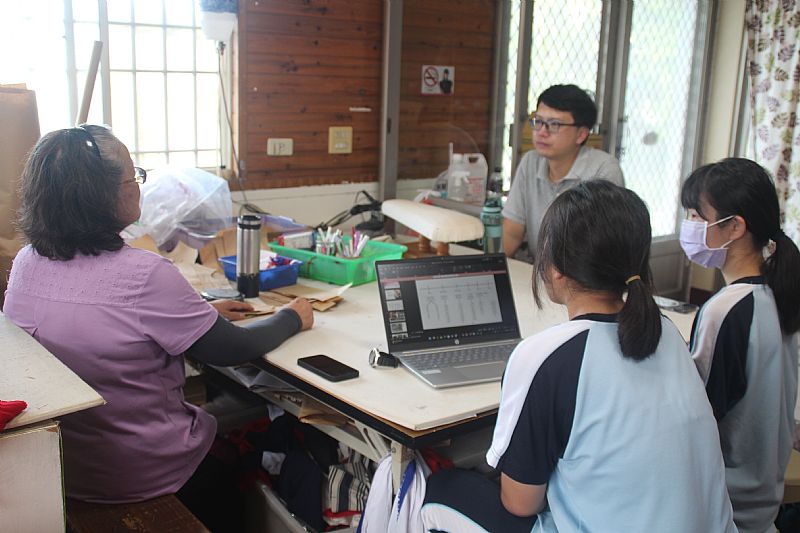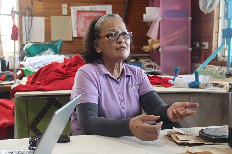 是何秀蘭女士正在為我們講解黑色族服轉變成紅色族的過程,還有製作族服的布料、工具、機器,以及她的生長歷程,還有說明位什麼會接觸製作族服的原因。