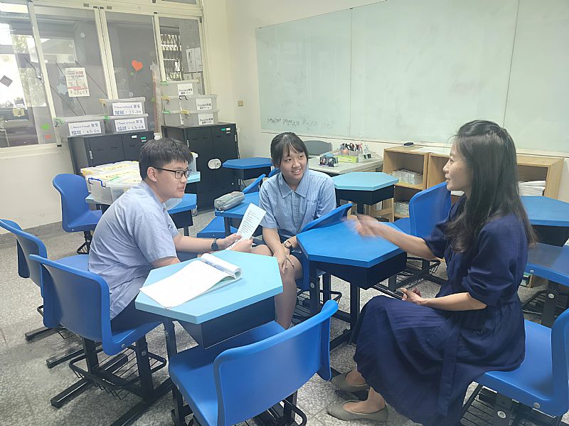 在學校空間與學務主任訪談,進行關於AI與未來在主任教學生涯中的應用等等問答。