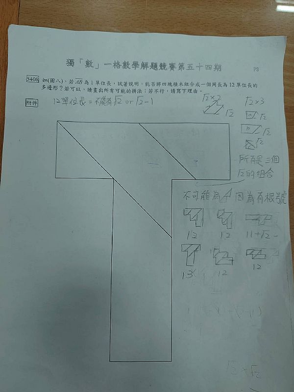 我們在暑假時解了獨數一格第54期中的T-puzzle的題目,我們遭遇了許多困難,但都一一克服。