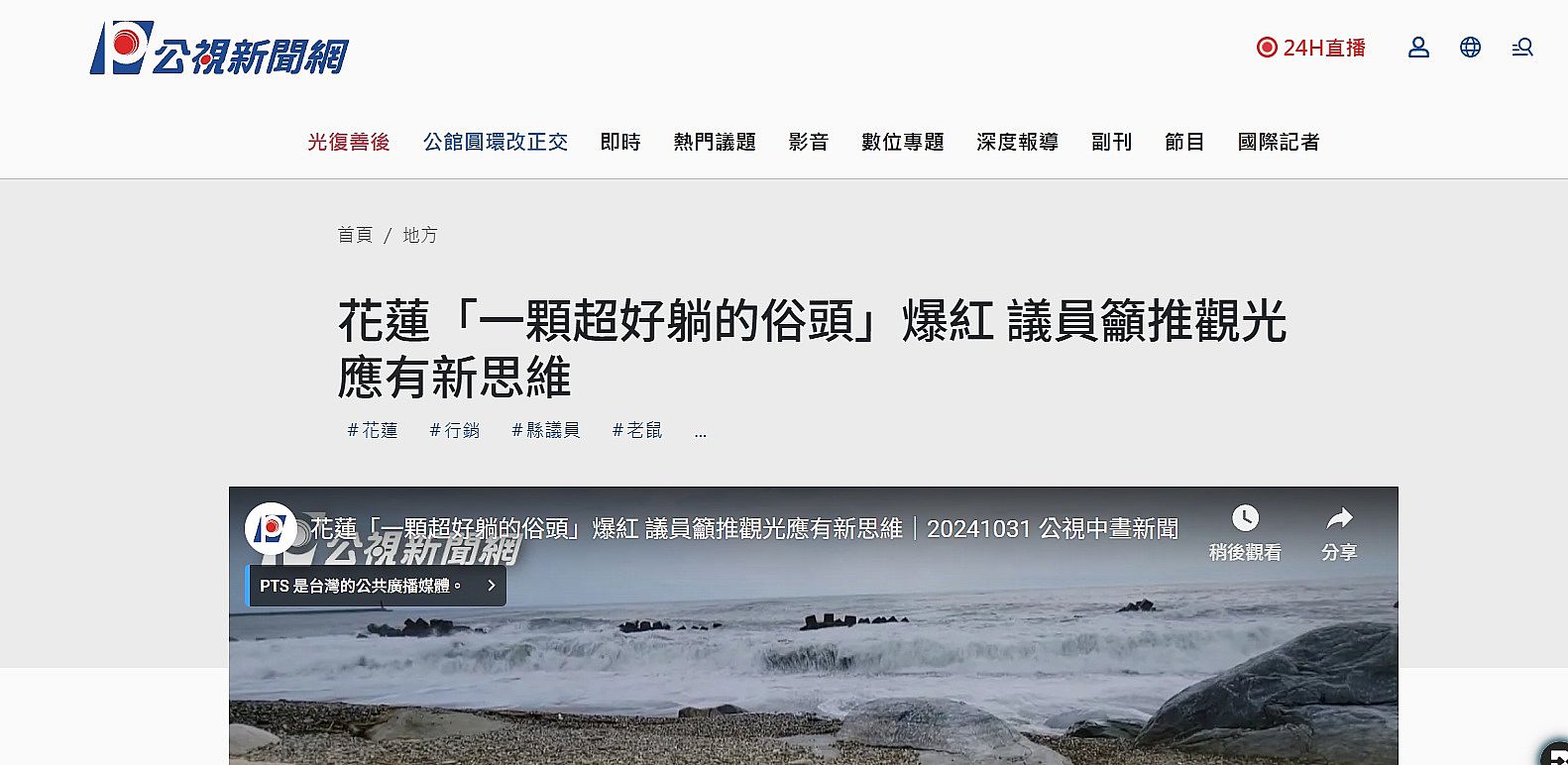 | 1 | ![]() | 網站名稱 公視新聞網-花蓮「一顆超好躺的俗頭」爆紅 議員籲推觀光應有新思維 網址 https://news.pts.org.tw/article/722002 網站簡介 新聞網中的一篇新聞,從中找到我們最初衷的概念:觀光應該有新的思維。 | 林曉微 | 2025/9/30 下午 03:49:12 |