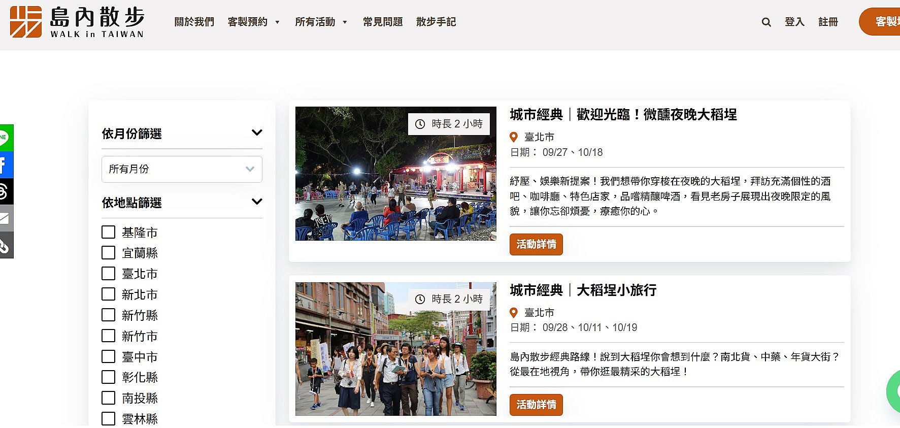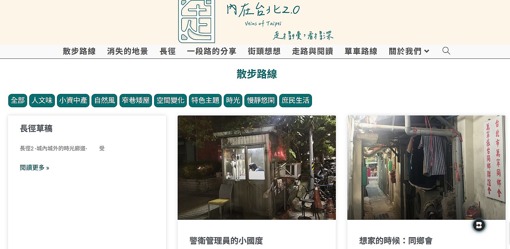 | 2 | ![]() | 網站名稱 內在台北 網址 https://www.veins-of-taipei.com/ 網站簡介 走路,是人類最基本原始的移動方式。 城市裡迷人的空間,也多半要在走路的狀態,才到得了、讀得到。 就在我們疏離土地已久,以及幾乎由速度、網路、消費主宰一切的此時,回望走路,卻見其「緩慢與深刻」的特質,恰恰成了當代最佳救贖。 其實不難,只要打開五感,邁開步伐便是。以雙腳為介面,往內打通身體心靈,往外深入城市經脈內裡,展開5分鐘、或一整日的雙向對話。 | 林曉微 | 2025/9/30 下午 03:51:24 |