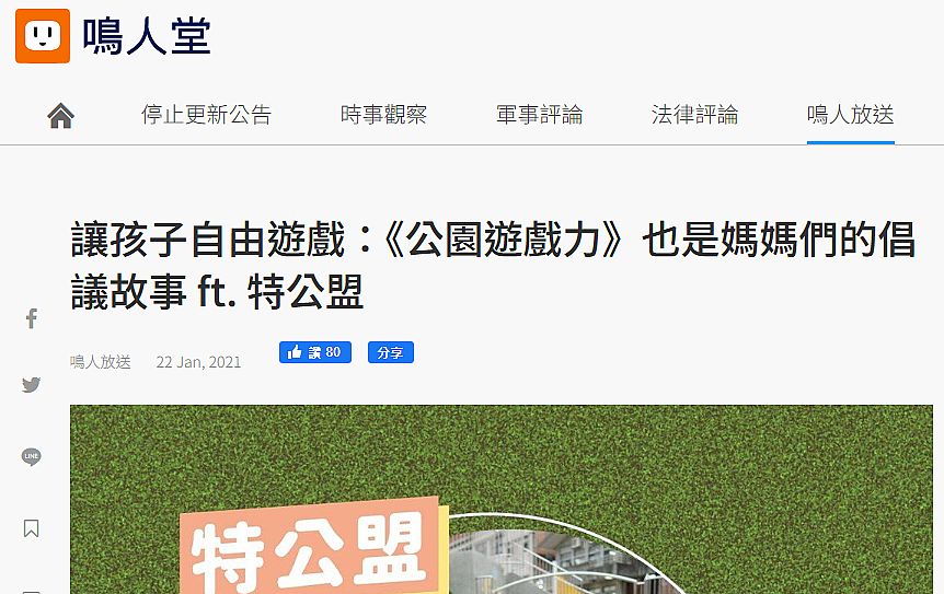 | 5 | ![]() | 作者 文:許伯崧,鳴人堂編輯;來賓:特公盟阿汀、阿君 來源 鳴人堂堂 描述 「這不只是特色公園的故事,也是一群女性的故事。」2015年,一名地方媽媽因為住家附近的青年公園大溜滑梯被拆,打1999主動瞭解後,卻得到「依法行政,謝謝指教」的回覆,名目上公家機關聲稱是「為了孩子的安全」,但地方媽媽心中依然有許多疑惑與不滿。於是,挾著這股盛怒的氣勢下,媽媽開設了臉書社團「臺灣還我特色公園行動聯盟」(下稱「特公盟」),有愈來愈多有同樣不解的家長們紛紛加入社團,自製文宣海報、發起連署,並在同年底為了孩子「遊戲」的權益站上街頭。 | 李中原 | 2025/9/25 下午 12:43:31 |