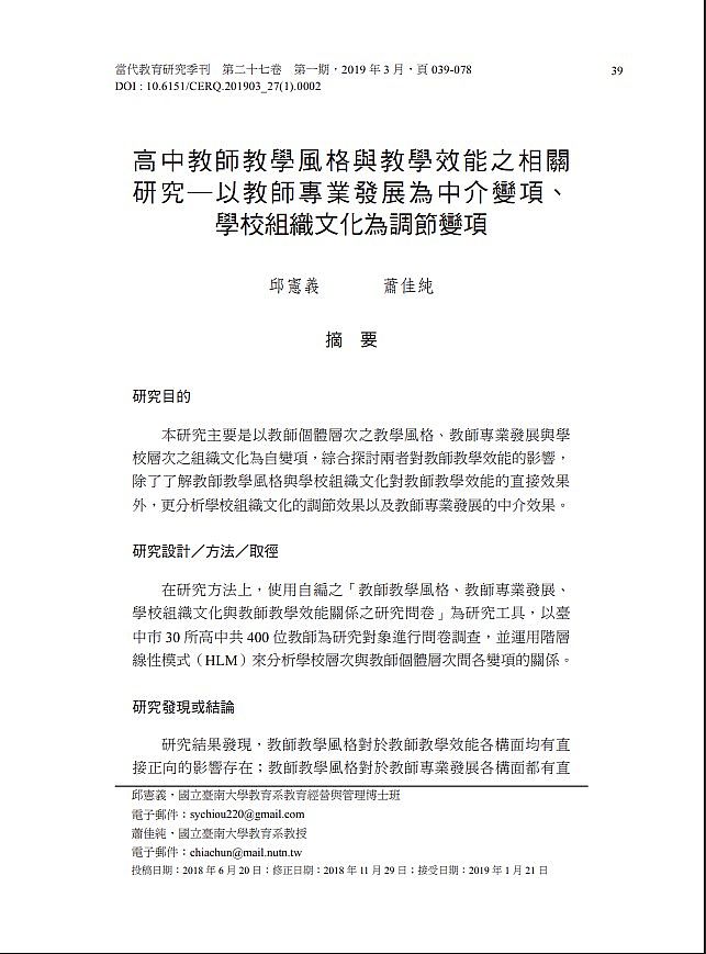 | 1 | ![]() | 網站名稱 高中教師教學風格與教學效能之相關 研究─以教師專業發展為中介變項、 學校組織文化為調節變項 網址 http://contemporary.cere.ntnu.edu.tw/sites/default/files/public/27-1-2_3114.pdf 網站簡介 本研究主要是以教師個體層次之教學風格、教師專業發展與學 校層次之組織文化為自變項,綜合探討兩者對教師教學效能的影響。 | 游惟勛 | 2025/9/12 下午 01:10:00 |