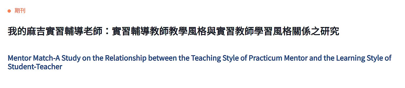 | 2 | ![]() | 網站名稱 我的麻吉實習輔導老師:實習輔導教師教學風格與實習教師學習風格關係之研究 網址 https://www.airitilibrary.com/Article/Detail/20713649-201306-201403190001-201403190001-1-24 網站簡介 本研究以Grasha之教學風格與Silver與Hanson之學習風格觀點,立意取樣四組教學與學習風格明顯,且為不同配對組合者為研究對象。以訪談法為主,觀察法為輔,試圖瞭解師徒式教育實習中實習輔導老師教學風格與實習教師學習風格之交互關係及其對師徒關係與實習結果的影響。 | 游惟勛 | 2025/9/13 上午 10:26:28 |