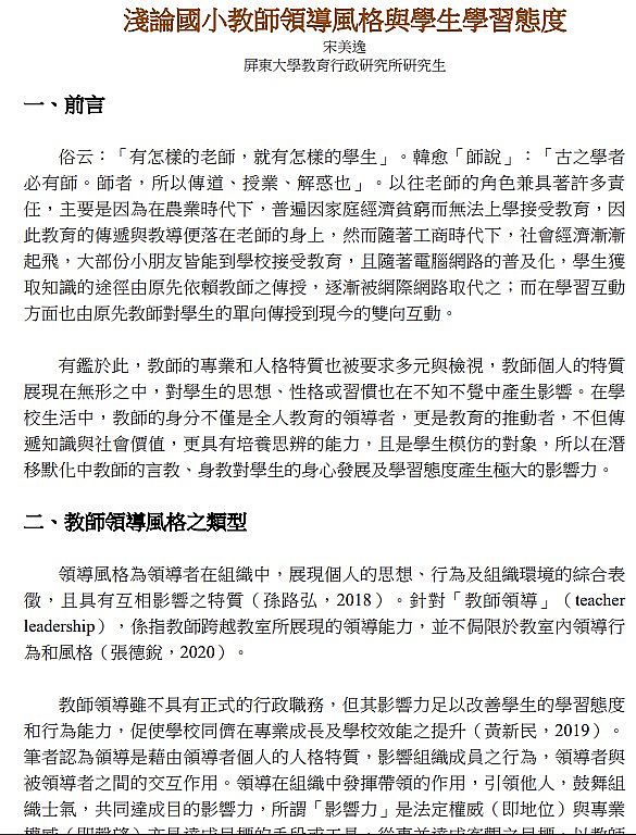 | 3 | ![]() | 網站名稱 淺論國小教師領導風格與學生學習態度 網址 http://www.ater.org.tw/journal/article/10-11/free/12.pdf 網站簡介 俗云:「有怎樣的老師,就有怎樣的學生」。韓愈「師說」:「古之學者 必有師。師者,所以傳道、授業、解惑也」。以往老師的角色兼具著許多責 任,主要是因為在農業時代下,普遍因家庭經濟貧窮而無法上學接受教育,因 此教育的傳遞與教導便落在老師的身上。 | 馮雋恩 | 2025/9/18 下午 04:30:20 |