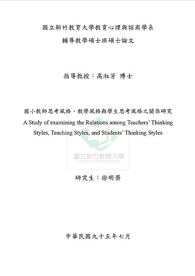 | 5 | ![]() | 網站名稱 國立新竹教育大學教育心理與諮商學系 網址 https://etd.lib.nthu.edu.tw/thesis/getfileful/9aac5c3b39bda6af1a2ba341541d26b4/189294/ 網站簡介 探討國小學生之思考風格與其低中高年段老師之思考風格與教學風格的可能關係 | 馮雋恩 | 2025/9/22 下午 04:39:17 |