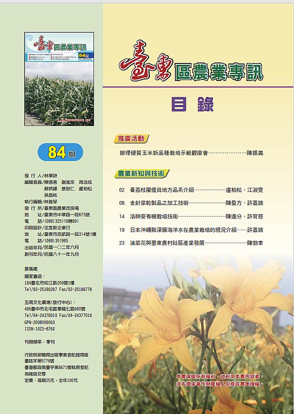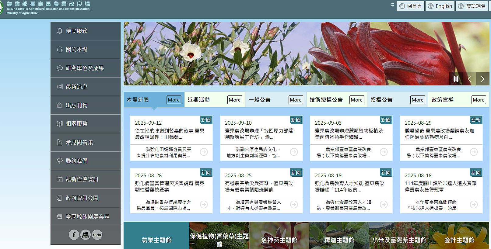 | 2 | ![]() | 網站名稱 農業部臺東區農業改良場 網址 https://www.ttdares.gov.tw/index.php 網站簡介 原鄉生態永續,各式農產品、保留植物品種等相關介紹。 | 邱意茗 | 2025/9/15 下午 04:24:56 |