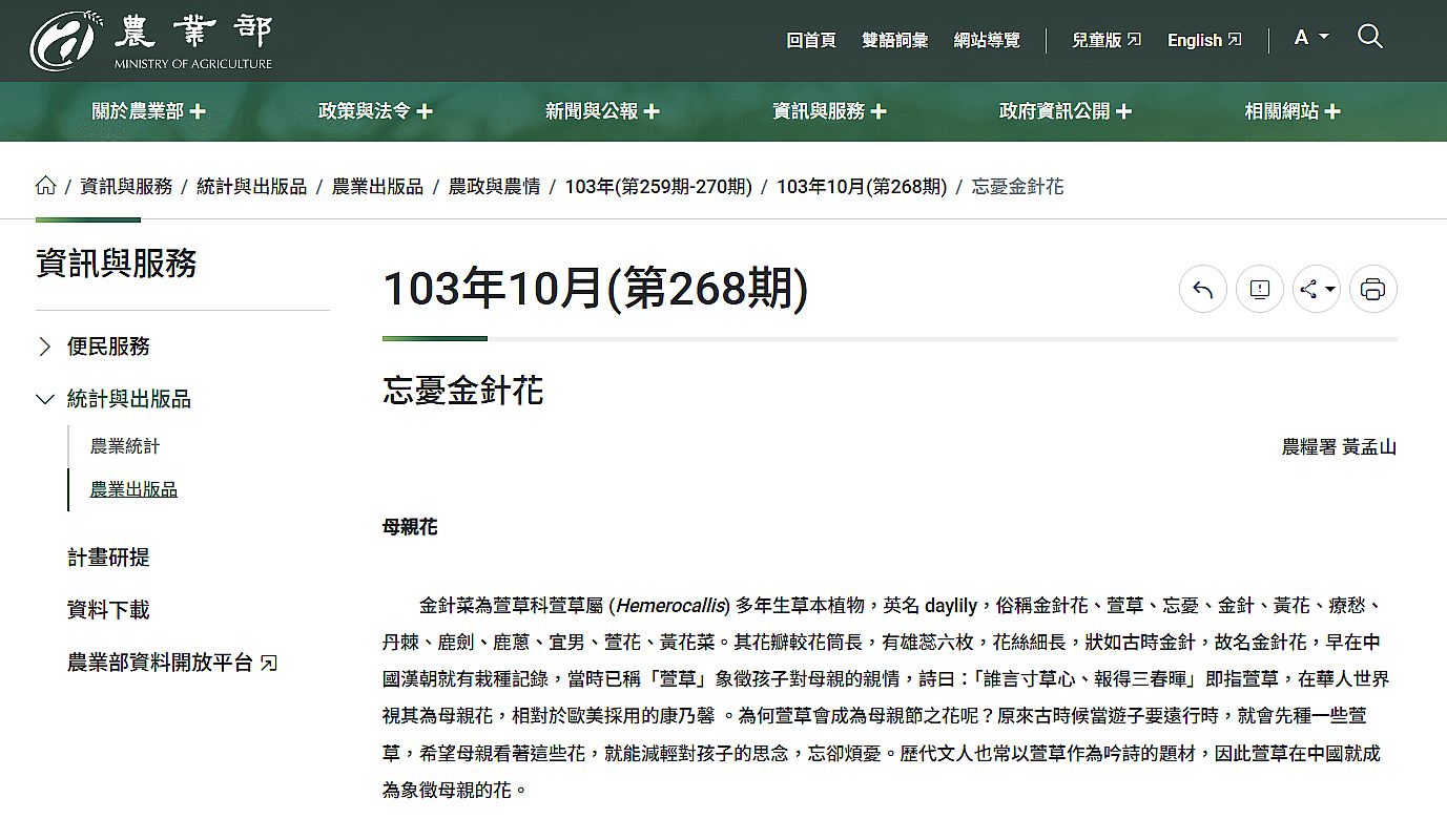 | 2 | 作者 黃宥心 標題 訪問金針山農民的回覆 內容 我從小就開始參與採收金針的工作,特別是在每年的七月底到九月底。記得第一次接觸金針的時候,發現花上面有一些白白的小蟲,原來那就是常見的蚜蟲。 有時候有人會問我,金針的採收時間是什麼時候?其實依地區不同有所差異: • 平地地區:4月30日到5月31日 • 山地地區:7月31日到9月30日 • 花期:大約在每年的8月到10月之間 當我們採收後帶回家怎麼保存呢?其實很簡單,就給他放冷藏保存,但不要讓金針接觸到空氣才不會開花,如果你是遊客,是不是乾燥的金針?變成乾燥金針前 我們會先日曬或用機器去烘乾,現在為了時間大部分的人都用機器去烘乾。 | 黃宥心 | 2025/9/15 下午 01:54:24 |