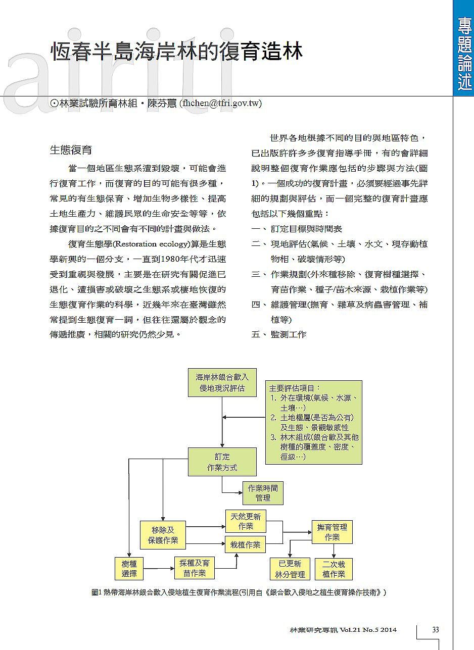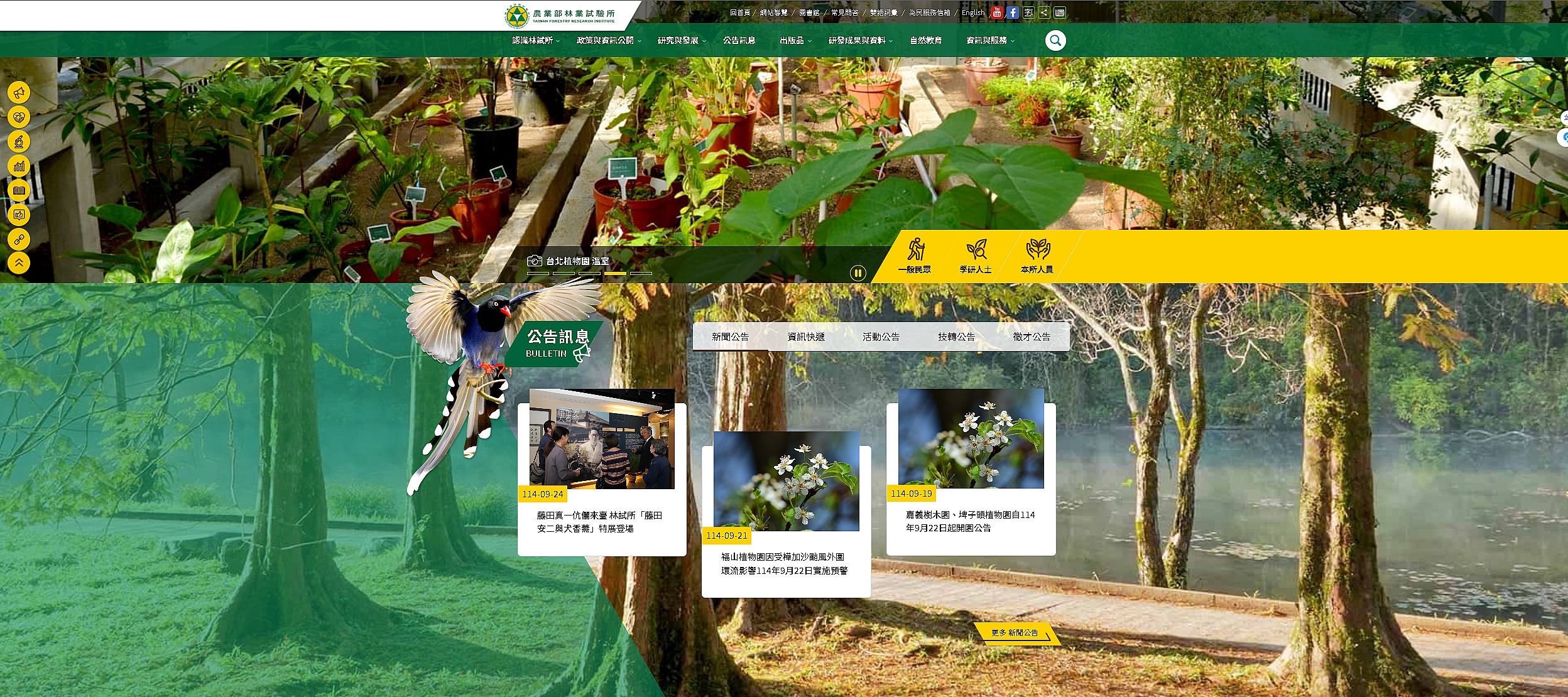 | 1 | ![]() | 網站名稱 農業部林業試驗所 網址 https://www.tfri.gov.tw/Default.aspx 網站簡介 農業部林業試驗所之前身創始於日治時期(西元1896年),迄今已逾百年。百年來,隨著時代的變遷及社會的需求,逐步調整組織業務,由一個「苗圃」擴大成目前六個林業技術組、四個行政單位及六個研究中心,並不斷地提昇林業試驗研究水準與品質,也已獲得豐碩之成果。 本所施政方向係以森林之永續經營與多目標利用為主,業務重點包括:森林資源保育、珍稀動、植物復育、固有樹種選育及優良樹種引進、育林技術及生物技術之改良、環境保護林之營造、森林病蟲害防治、天然林經營、人工林中後期撫育、集水區綜合經營、林產品加工技術改進、自然解說教育及森林遊憩品質提升、植物園及試驗林示範經營等。 森林覆蓋佔臺灣面積一半以上,可說是全島自然環境的主體。再者,從生態環境倫理學演進之觀點而言,森林是孕育人類文明之搖籃。因此,本所未來之目標是在提倡森林文化之前提下,整合群體研究力量,發展具有人文內涵之林業科技。換言之,就是在人類與自然共存共榮之謙和意念下,依循森林的自然循環規律,發揮智慧與努力,重新思考順天應人的森林經營理念,以及建立相關技術與制度,實踐在林業經營工作上,使其對人類生活之進步及社會文明之發展,再做出貢獻。相信在本所同仁群策群力下,必能為台灣的林業研究建立新貌。 最後更新日期:112-07-27 | 魏仲良 | 2025/9/26 下午 05:21:23 |