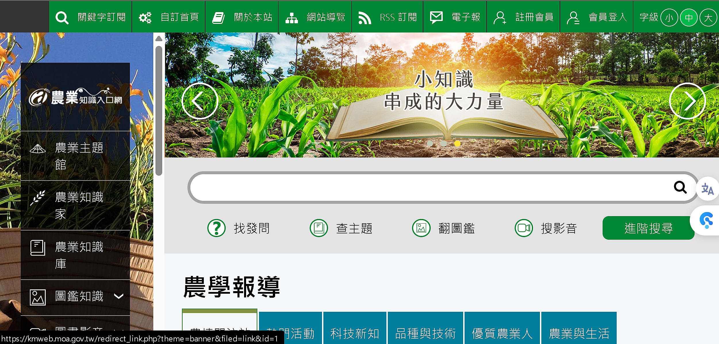 | 2 | ![]() | 網站名稱 農業知識入口網 網址 https://kmweb.moa.gov.tw/index.php 網站簡介 關於本站 挑戰二00八國家發展重點計畫 當前為我國農業發展的關鍵時刻,極具挑戰,也充滿機會,農業部配合行政院所提「挑戰二00八:國家發展重點計畫」,本於「以人為本,永續發展」理念,採取「全球接軌,在地行動」策略,以全新的思維,全新的做法,進行結構性與制度性的調整,以企業的活力與效率,營造出一個有效率及安定的農業經營環境,促使農業轉型升級,並充分發揮農業與農村的多元功能,讓全民共享農業之美。 「發展重要農業產業知識管理應用計畫」 為協助農民及農民團體取得農業生產及經營管理之核心知識,改善生產管理、經營績效與創新,相關具體工作重點包括規劃建立農業知識庫;蒐集及探索農業知識元件,發展農業知識檢索工具;規劃建置總體農業環境資料庫,開發知識管理資訊應用系統,逐步建立功能模組化專家系統,推廣及宣傳農業知識管理運用。 本站成立目的 緣此,農業部特別成立「農業知識入口網站」,並設立下列目標。 一、建置台灣優質農業知識之知識庫 本站整合「農業知識管理加值系統」,由農業部所屬的優質農業研究團隊-各農業試驗所及各改良場的研究人員-提供珍貴的農業知識。並針對消費者、生產者及學者等不同的身分分眾,分享珍貴的台灣農業發展知識。藉由「農業知識庫」單元的建置,期能讓國人有機會接觸與了解台灣的農業精進的成果。 二、提供台灣農業相關分類作物之主題館 持續建置農、林、漁、牧、其他等各項農業主題分類之知識主題館。依主題建置單一之主題館,將特定作物關連性知識文件、圖片及生活資訊等,經專家整理以系統化架構單位呈現,提供民眾可針對各別主題進行深淺的瀏覽及導引,以農業知識貫穿各主題站,使網站內容包含廣度及深度的農業知識。 三、分享台灣的優質農家經驗 隨著台灣經濟的快速發展,台灣的農業也持續的在蛻變,台灣的優質農民功不可沒。這些農業的推進器不僅配合台灣的農業政策與輔導,期望能提供台灣居民高優質的農產品。透過「主題報導專欄」、「農業與生活」、「新優質農家」、以及「產銷專欄」等單元,讓國人能有機會接觸與了解台灣農業的推手。 四、蒐集多樣化的農業資源 農業部所屬機關有眾多多媒體檔案及可幫助農友的系統。故以「影音專區」彙整分類各類影音資料,易引導觀看及學習;而應用農業知識及創新服務,則可在「資源推薦」找尋,冀望在善用資訊與網路工具下,更易於滿足使用者知識獲取的需求。 五、建立台灣的農業知識論壇 本站除了提供重要的農業外顯知識,也設立了「農業知識家」單元,是個屬於內隱知識的匯集園地。期待透過這個管道,能夠促進關心台灣農業發展的人士,提出討論意見與建言。 | 魏仲良 | 2025/9/26 下午 05:30:49 |