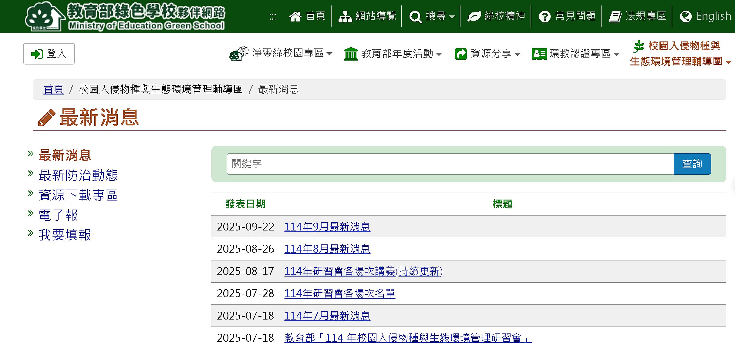 | 3 | ![]() | 網站名稱 校園入侵物種與生態環境管理輔導團 網址 https://www.greenschool.moe.edu.tw/gs2/is/news.aspx 網站簡介 綠色學校是全校式(whole school approach)推動環境教育、永續發展教育的策略,強調環境倫理,師生共同參與規劃和實施的歷程,並且整合學校的政策與管理、校園建築與空間、課程與教學、和學校與社區互動及生活實踐四個面向,共同營造學校生態及永續發展的文化氛圍。 教育部綠色學校夥伴網路計畫 此計畫自2000年開始,由國立臺灣師範大學環境教育所團隊創發,包括:此環境教育推動策略的理念、獎勵機制及推廣,教育部長期支持及指導,環資國際有限公司的網站升級與維護。 | 魏仲良 | 2025/9/26 下午 05:34:12 |