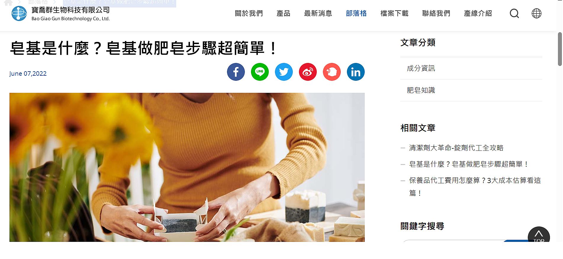 | 2 | ![]() | 網站名稱 寶喬群生物科技 網址 https://www.bgg.com.tw/blog/soap_base 網站簡介 有接觸肥皂DIY的人一定對皂基不陌生,但一般人對於皂基會有一些迷思,像是「不天然」、「乾澀難洗」、「含酒精」、「有防腐劑」等等,但你真的了解皂基嗎?今天小編就要跟大家介紹手工皂基的特性,讓你重新認識皂基! | 張能碩 | 2025/9/22 下午 02:37:43 |