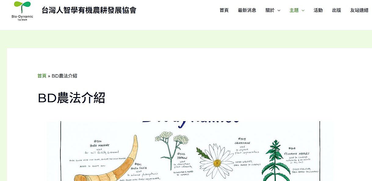 | 1 | ![]() | 網站名稱 台灣人智學有機農耕發展協會 網址 https://biodynamic.tw/bdintro/ 網站簡介 世界級的生機互動農業與人智學講師,深入理解生機互動農業背後哲理與原則,並透過與學友的相遇打造社群支持彼此的學習。 | 謝國祥 | 2025/9/24 上午 11:14:45 |