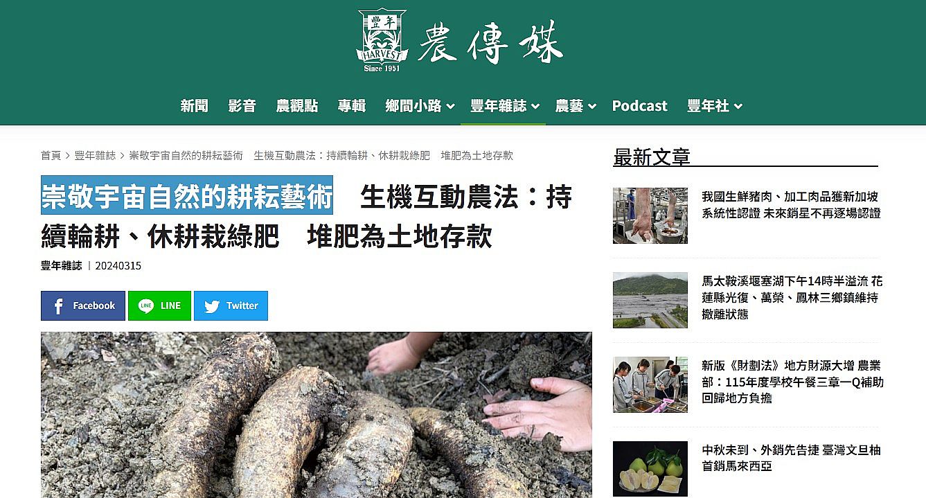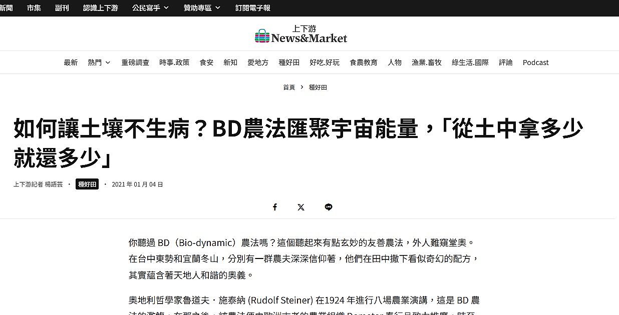 | 3 | ![]() | 網站名稱 上下游-如何讓土壤不生病?BD農法匯聚宇宙能量,「從土中拿多少就還多少」 網址 https://www.newsmarket.com.tw/blog/143801/ 網站簡介 上下游News&Market(新聞市集)創辦於2011年,是一個關心農業以及友善土地議題的社會企業。 | 謝國祥 | 2025/9/24 下午 12:07:23 |