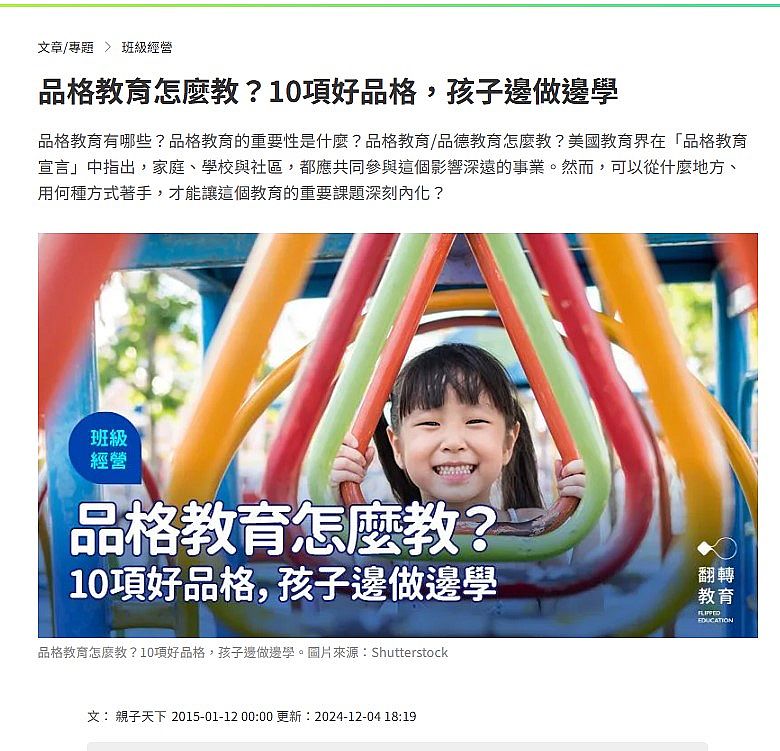 | 1 | ![]() | 網站名稱 翻轉教育-親子天下撰寫文章 網址 https://flipedu.parenting.com.tw/article/000140 網站簡介 品格教育怎麼教?10項好品格,孩子邊做邊學 | 張家瑜 | 2025/9/26 上午 09:59:50 |