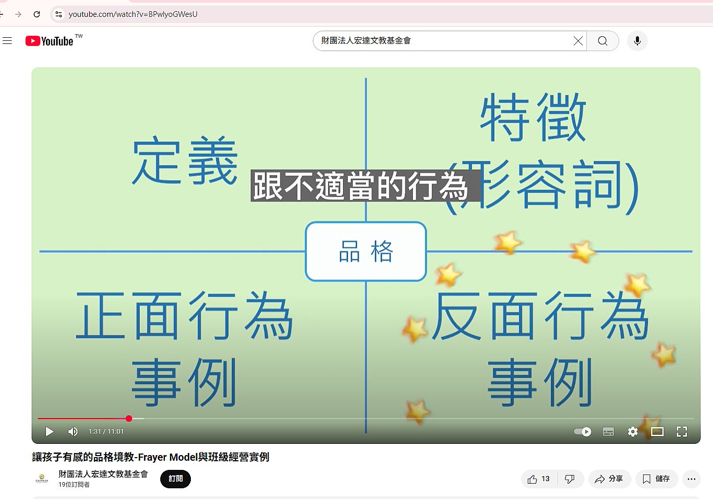 | 2 | ![]() | 網站名稱 youtube 網址 https://www.youtube.com/watch?v=BPwlyoGWesU 網站簡介 讓孩子有感的品格境教-Frayer Model與班級經營實例 | 張家瑜 | 2025/9/26 上午 10:09:56 |