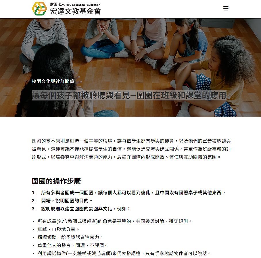 | 3 | ![]() | 網站名稱 財團法人宏達文教基金會 網址 https://www.htcfoundation.org.tw/knowledge/show/11 網站簡介 讓每個孩子都被聆聽與看見—圍圈在班級和課堂的應用 | 張家瑜 | 2025/10/1 下午 02:57:10 |