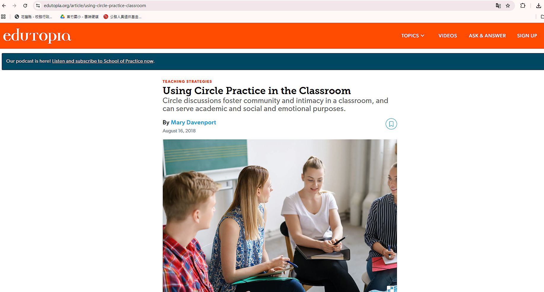 | 4 | ![]() | 網站名稱 Using Circle Practice in the Classroom 網址 https://www.edutopia.org/article/using-circle-practice-classroom 網站簡介 圍圈討論可以促進課堂上的參與感和親密感,並且可以達到學術、社交和情感連結的目的。 | 張家瑜 | 2025/10/1 下午 02:59:07 |